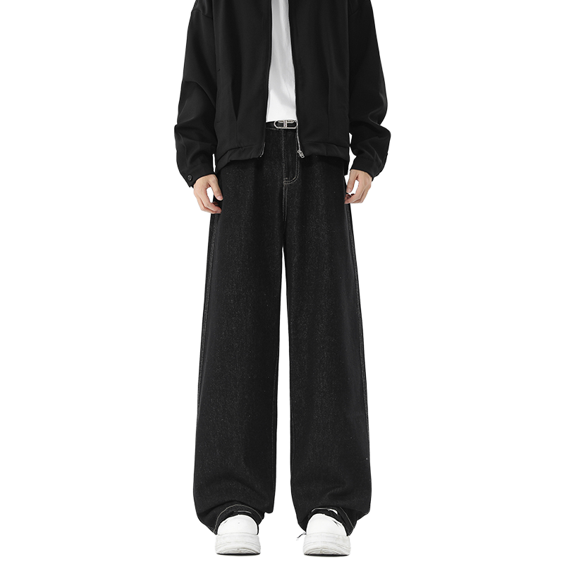 NEVERNEED黑色直筒牛仔裤男女秋冬季加绒美式休闲阔腿A字微喇长裤