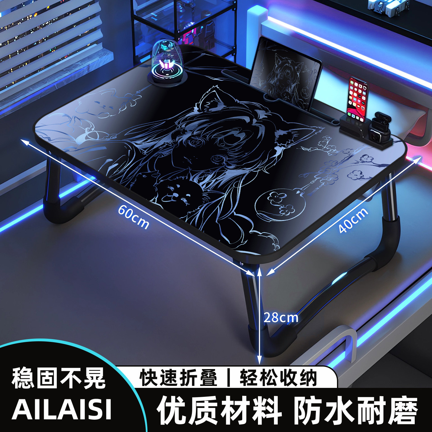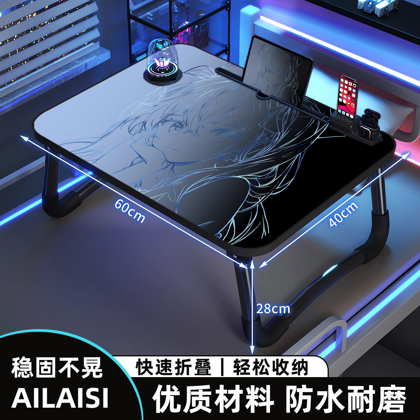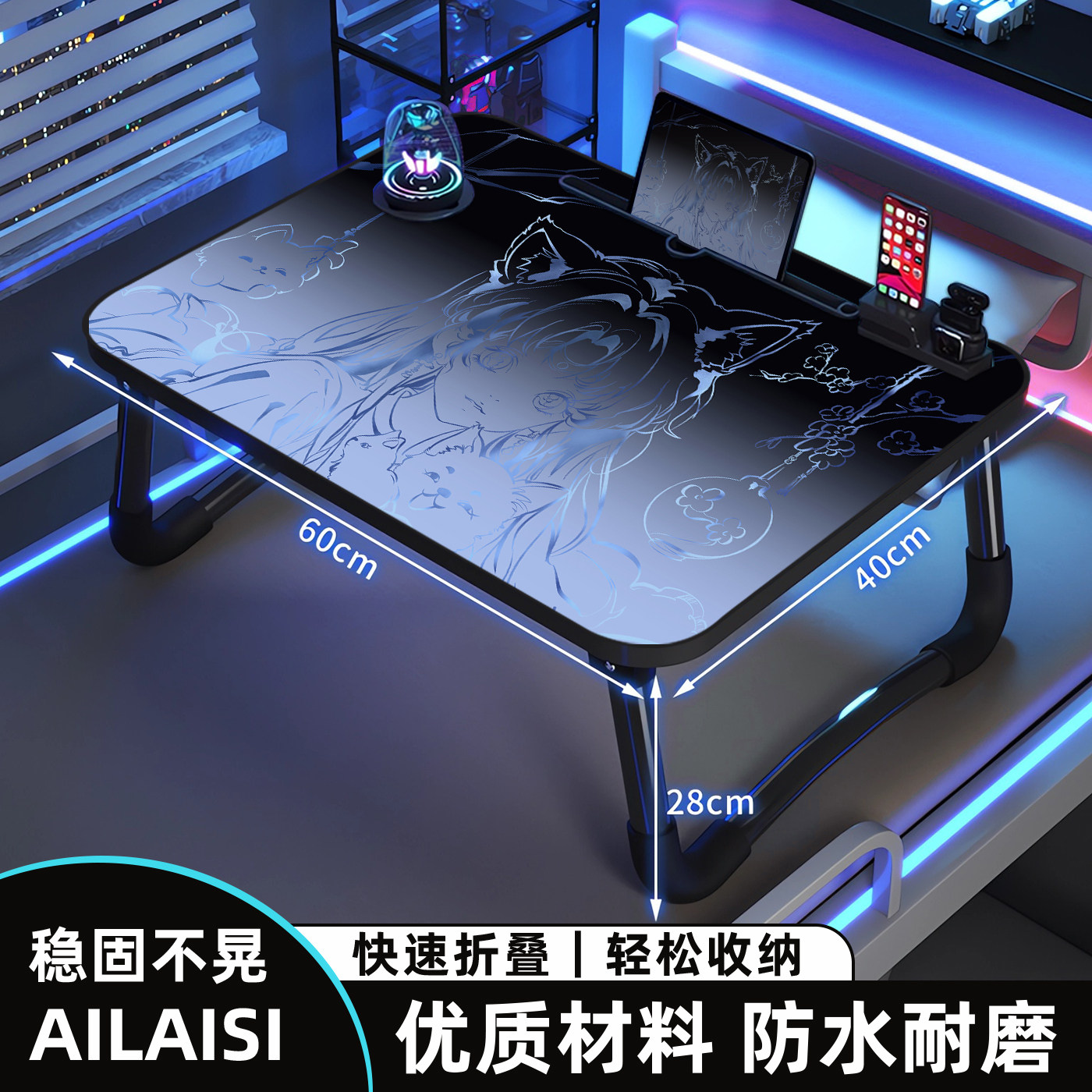 黑蓝渐变上小桌子可折叠小桌板笔记本电脑桌二次元床上桌子男生宿舍学生懒人桌学习阅读桌卧室床边书桌可定制