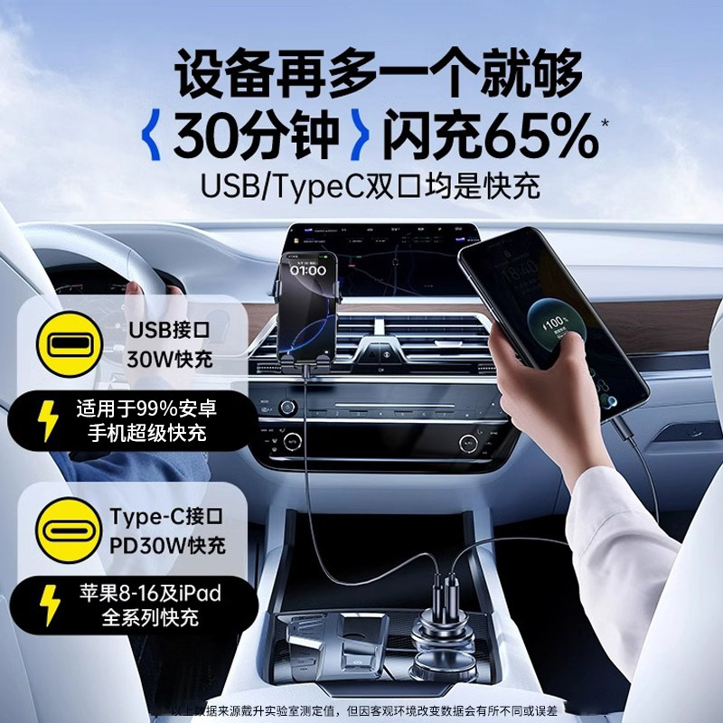 倍思车载充电器快充一拖二车充自带PD双线汽车点烟器适用苹果华为