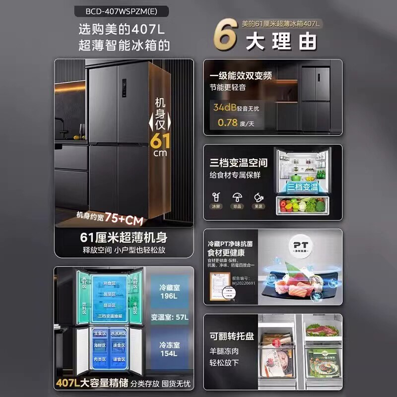 以旧换新丨超薄冰箱美的官方旗舰店十字四门无霜家用407双变频