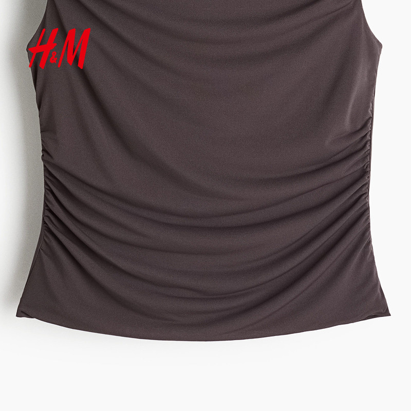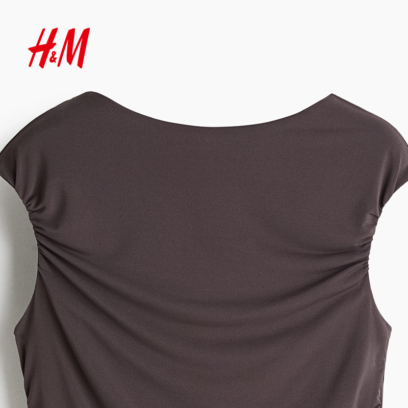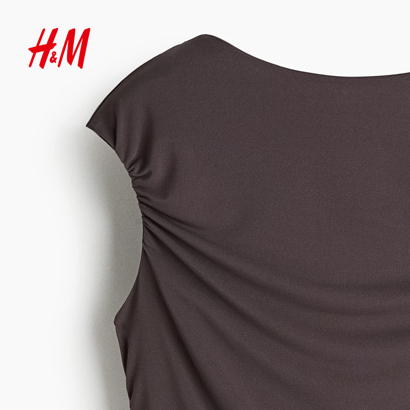 HM女装T恤2025年冬季新款垂坠盖袖款一字领褶皱修身上衣1300538