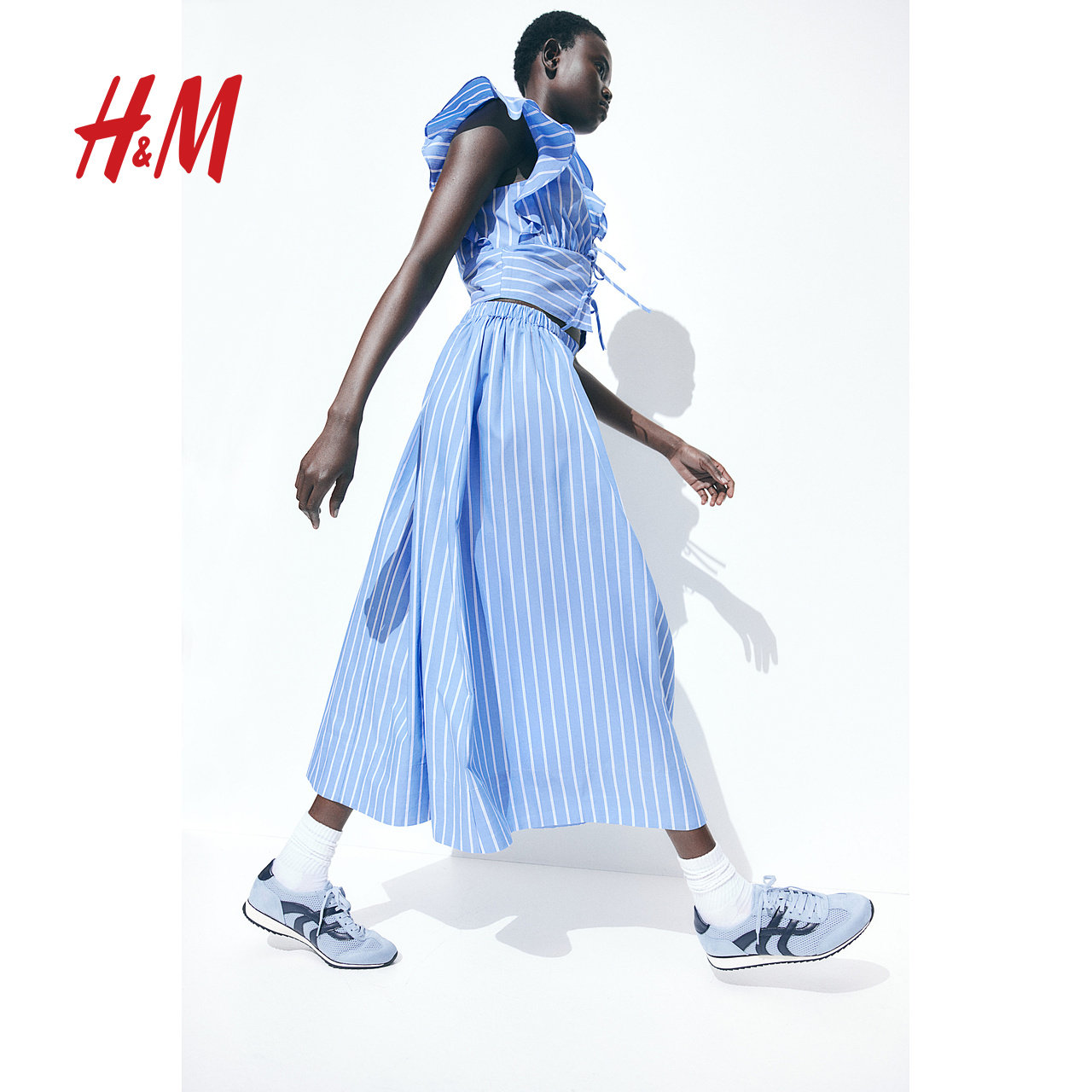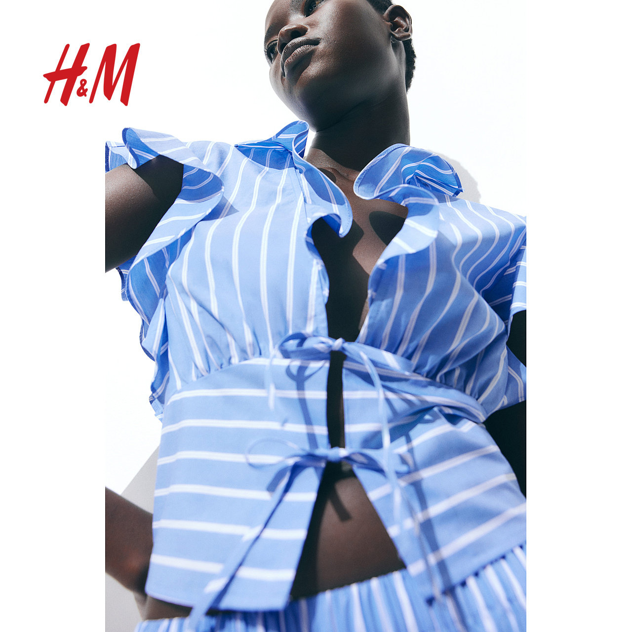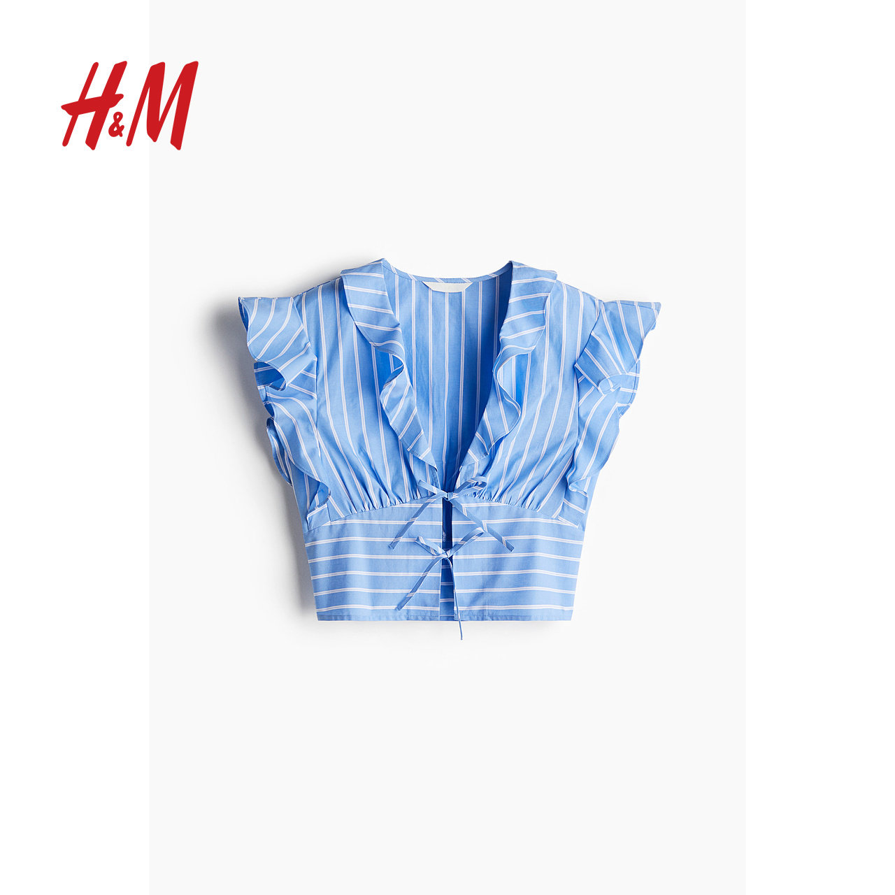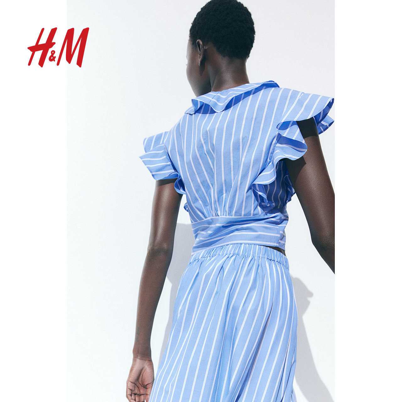 HM女装衬衫春季荷叶领短袖条纹修身短款飞袖上衣1278438
