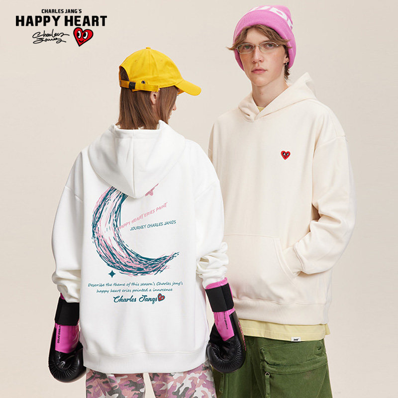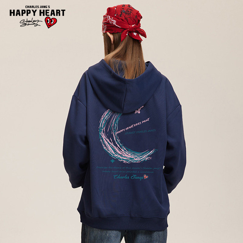 查尔斯桃心 美式涂鸦月亮印花长袖连帽卫衣男春秋季新款宽松休闲