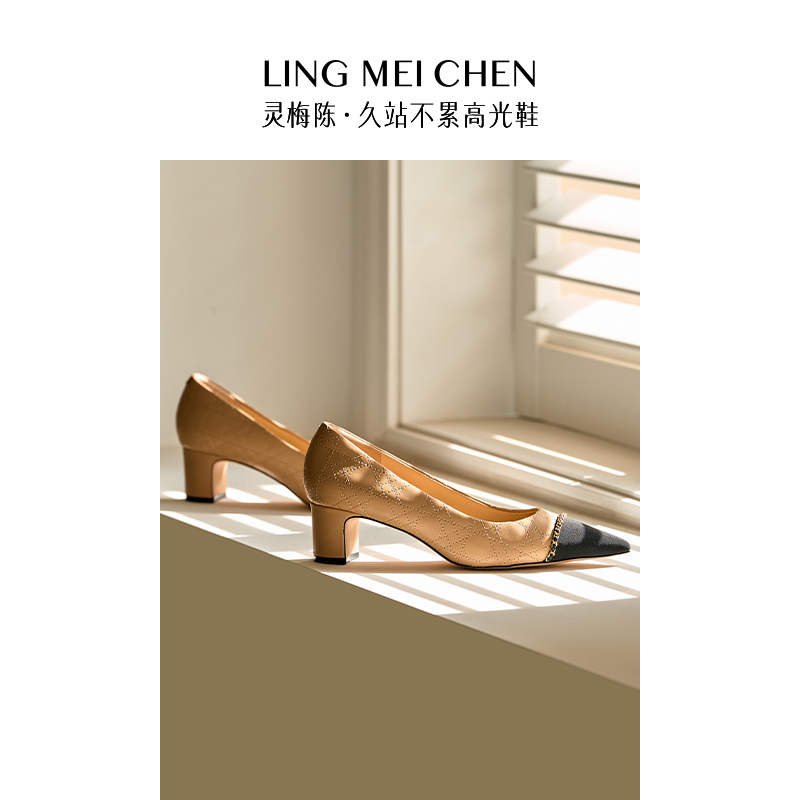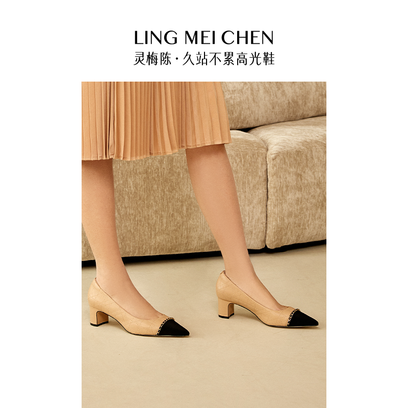 LINGMEICHEN小香风单鞋尖头拼色高跟鞋新款粗跟气质裸色中跟女鞋