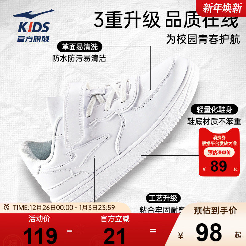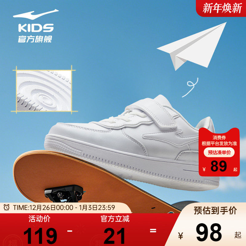 特步童鞋儿童小白鞋男童板鞋秋冬男孩学生白色运动鞋女童鞋子棉鞋