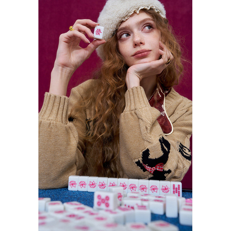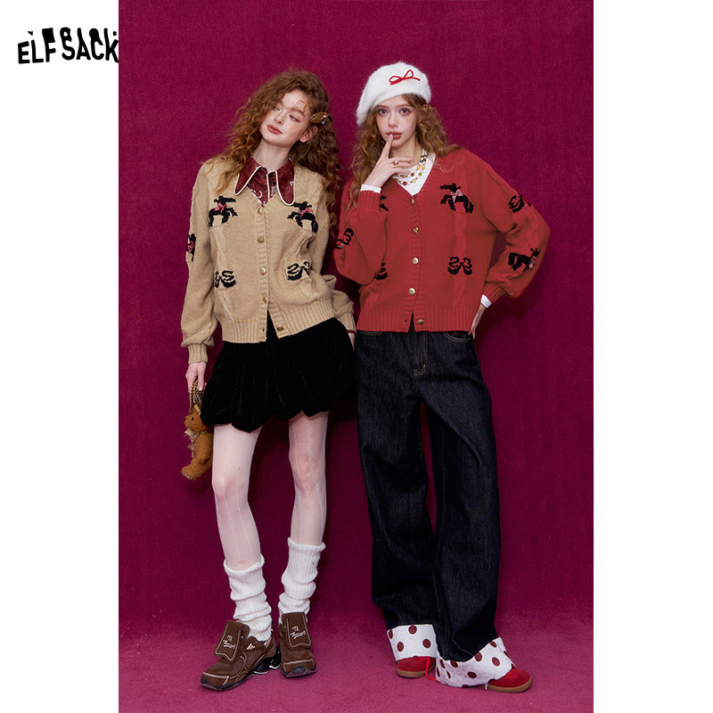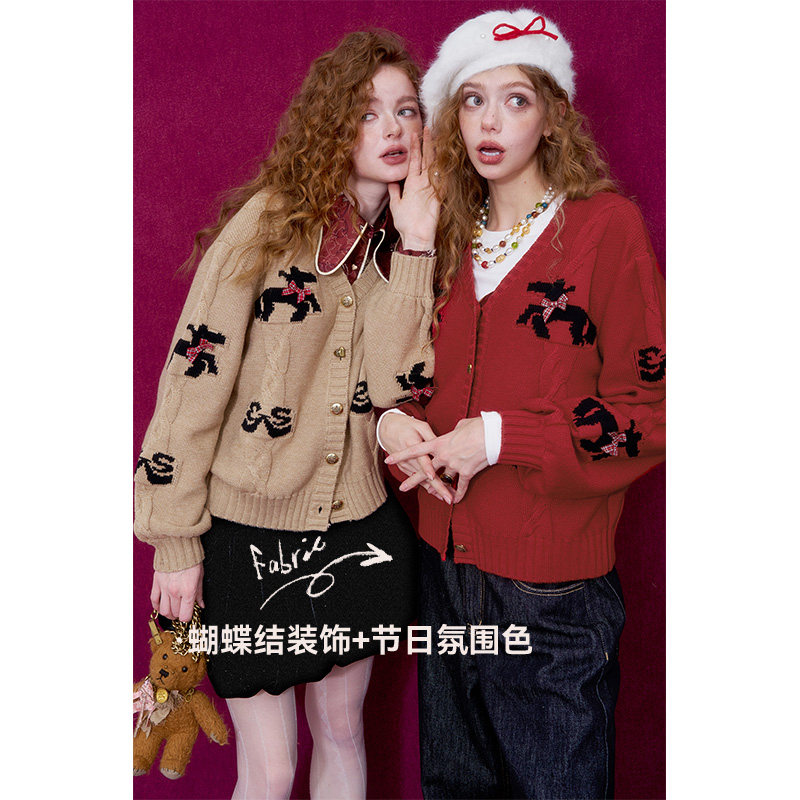 妖精的口袋甜美蝴蝶结小马针织开衫女2026春新款新年战袍红色毛衣