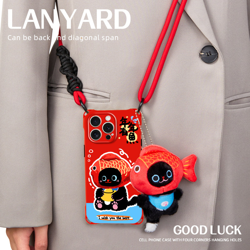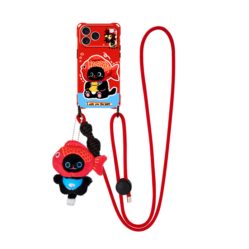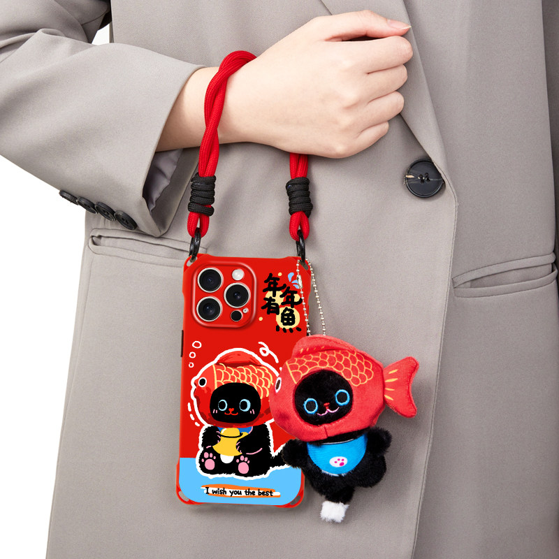 鱼头猫猫适用华为mate60苹果17promax手机壳小众红色iphone16挂件腕带15PRO新款pura70ultra挂绳背带13手提14
