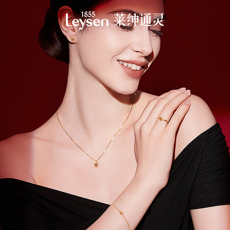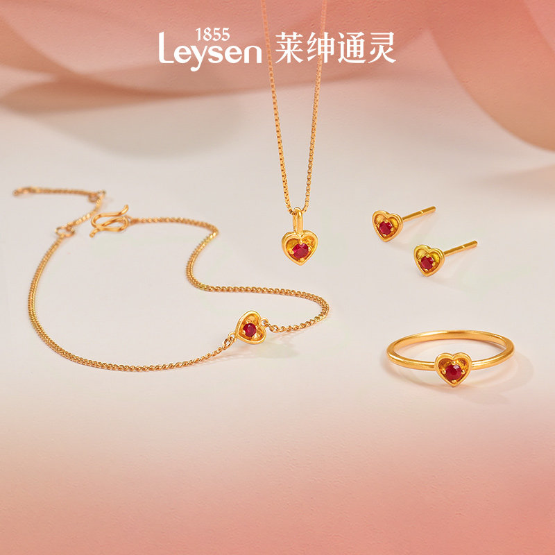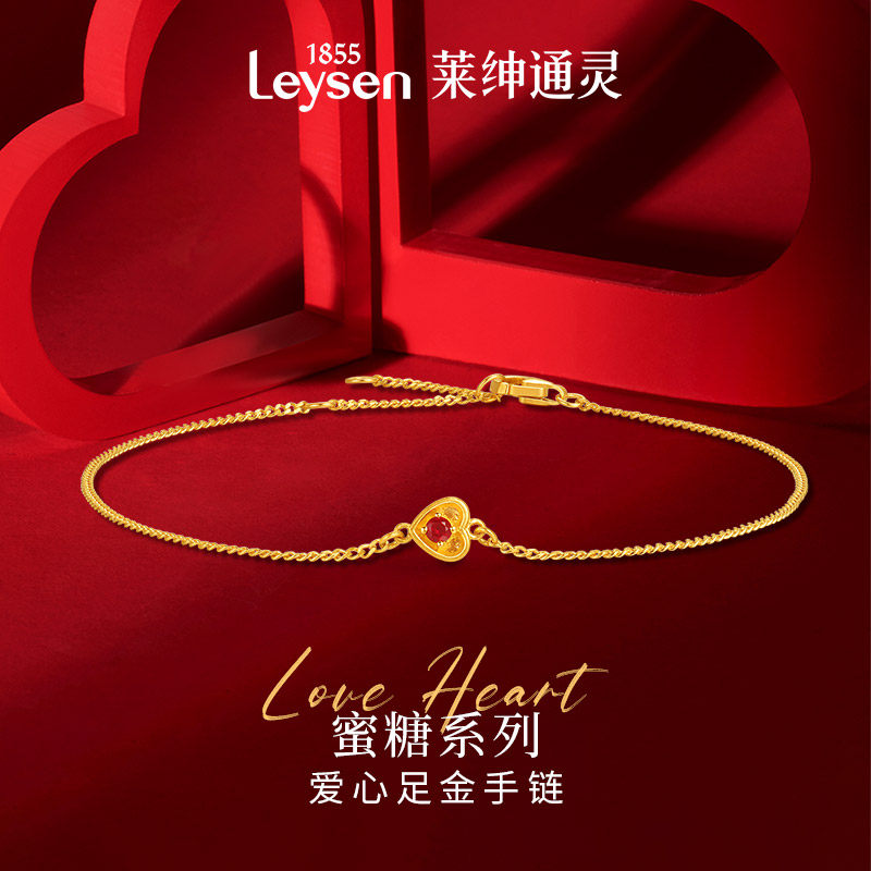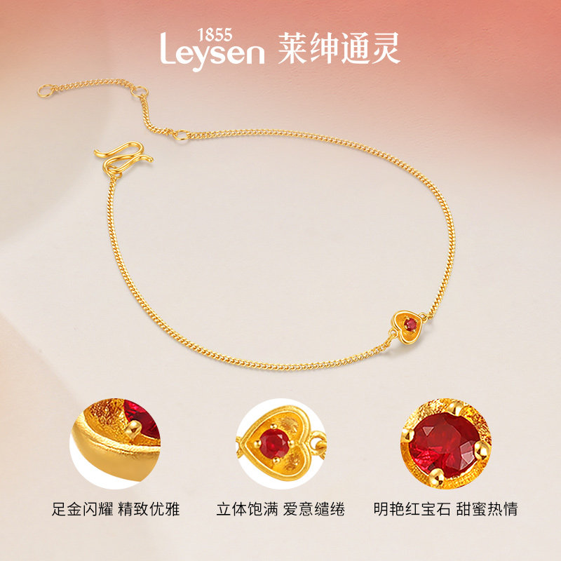 莱绅通灵蜜糖系列 爱心足金999古法黄金红宝石手链手环手镯简约