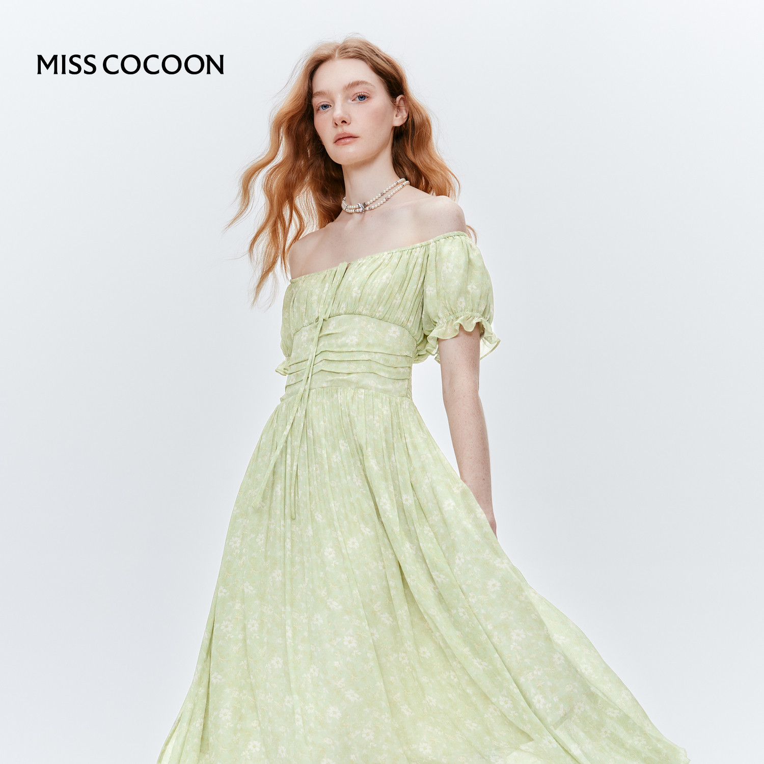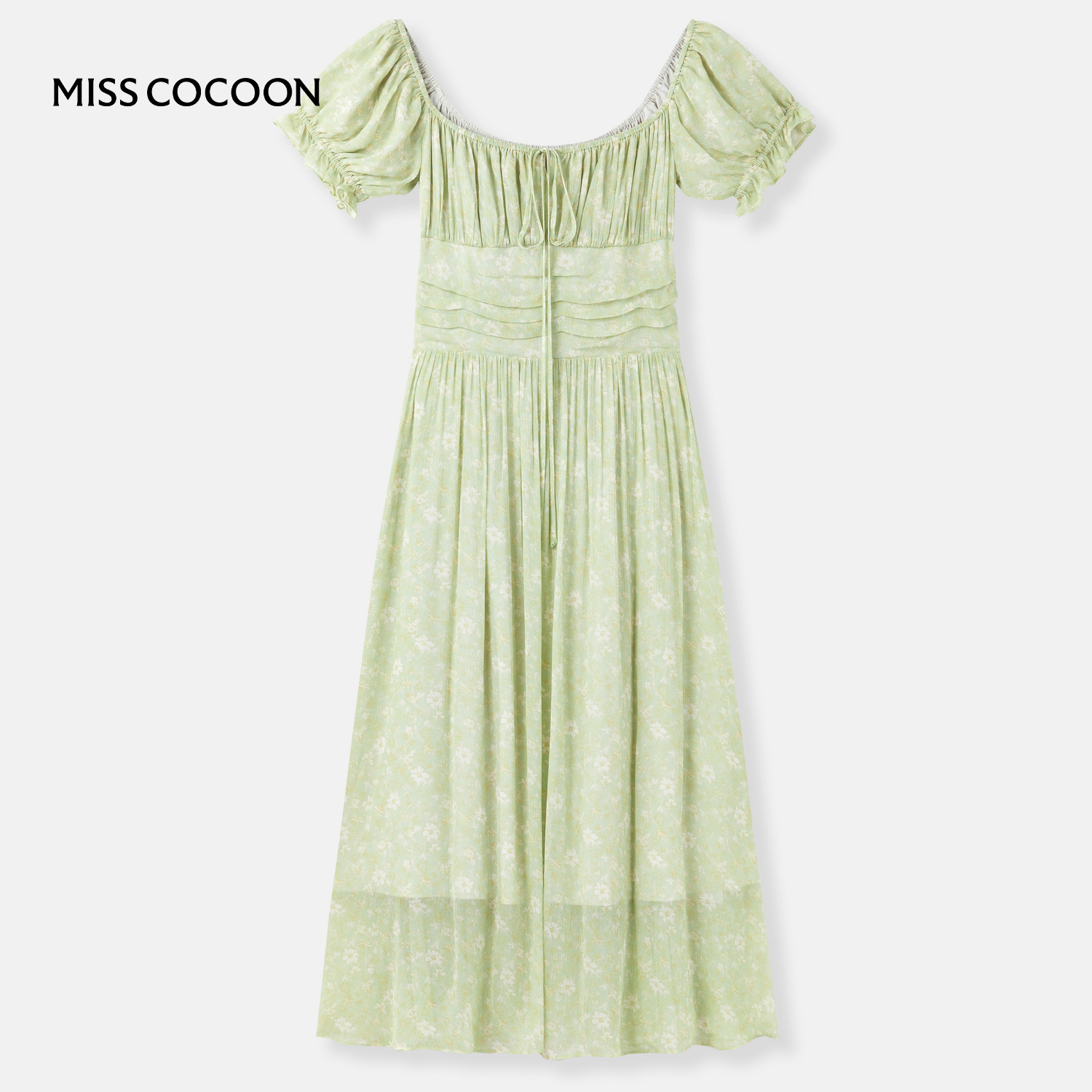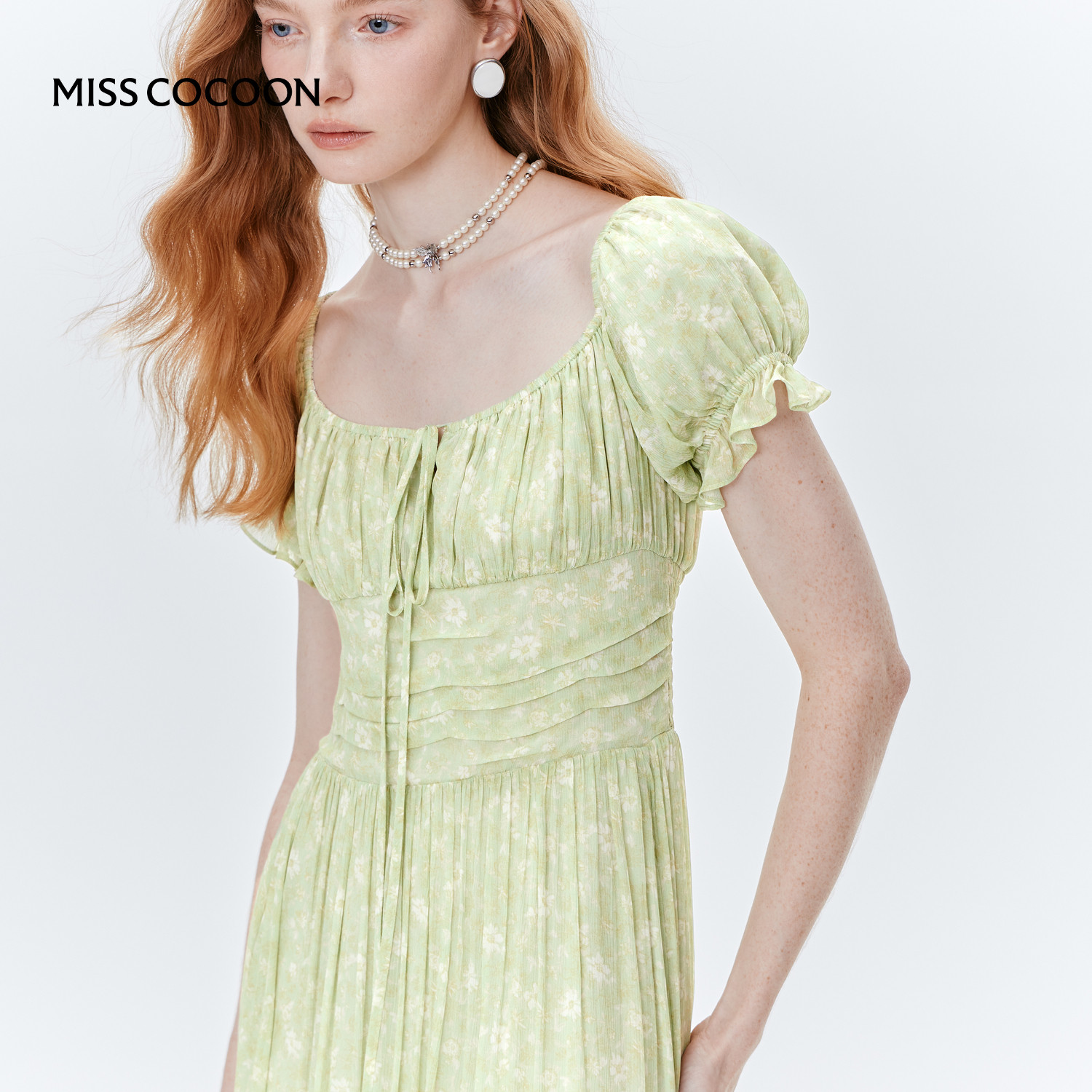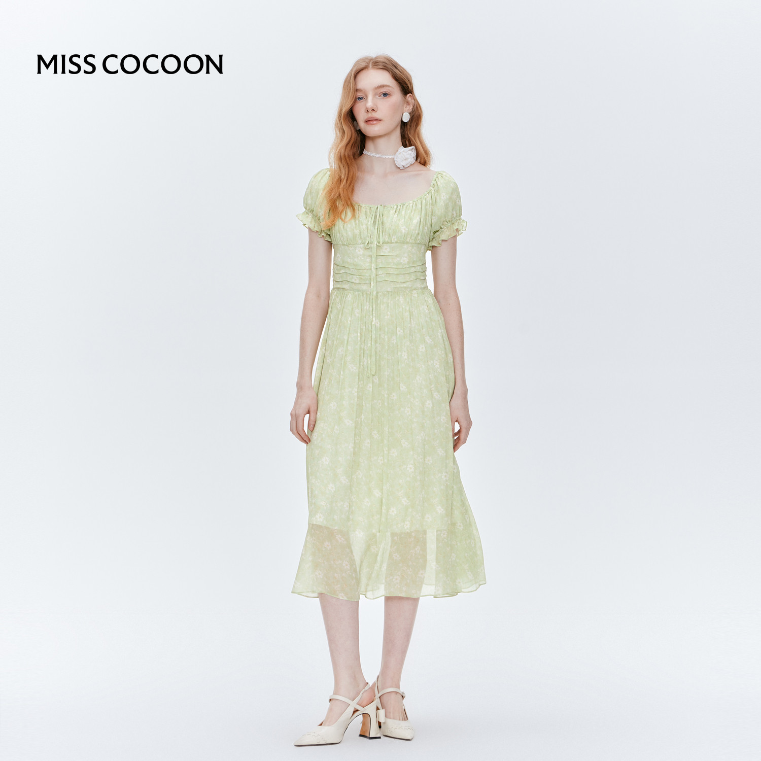 MISS COCOON可可尼泡泡袖U领收腰长裙2025秋季新款女士法式连衣裙