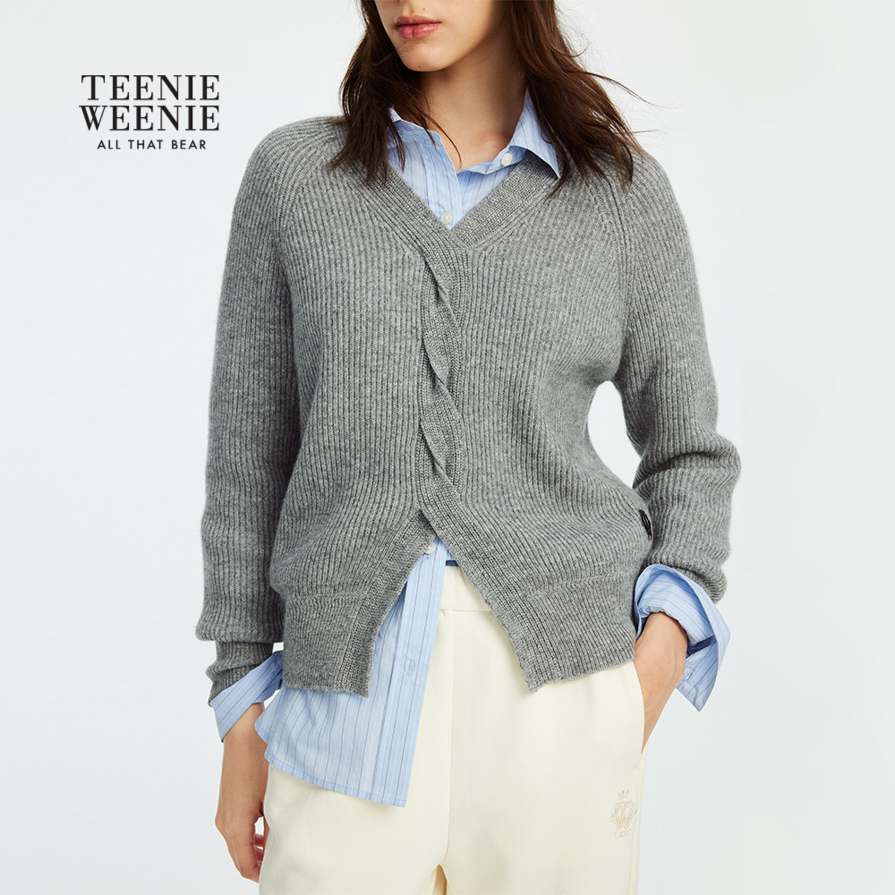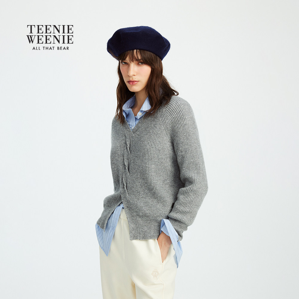 【含绵羊毛】TeenieWeenie小熊女装毛衣2025秋季新款绞花V领上衣