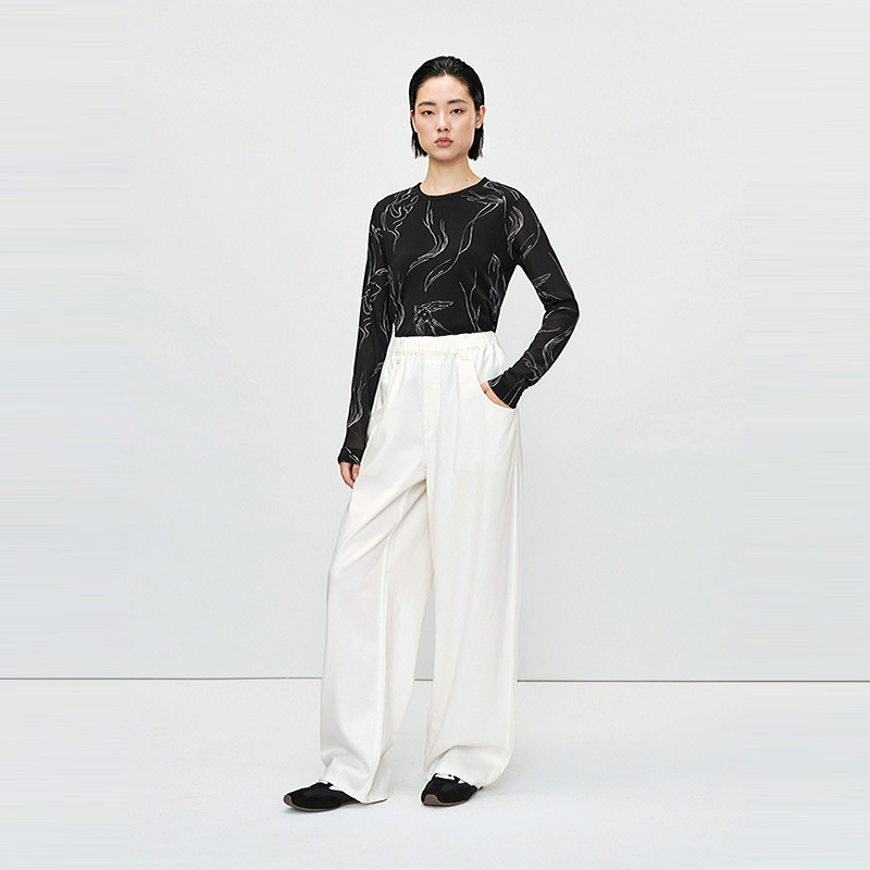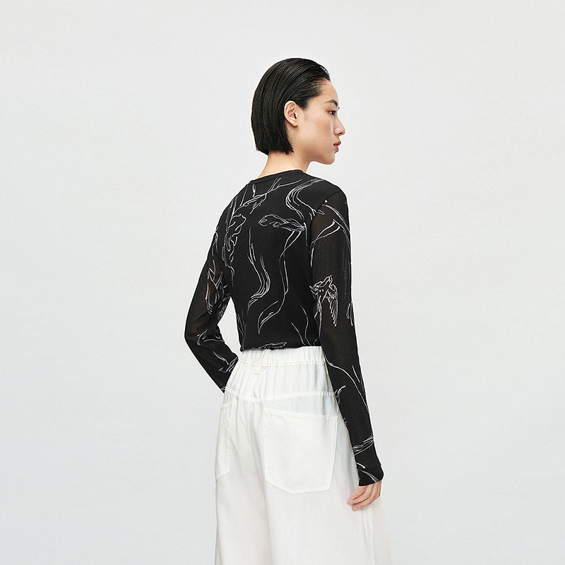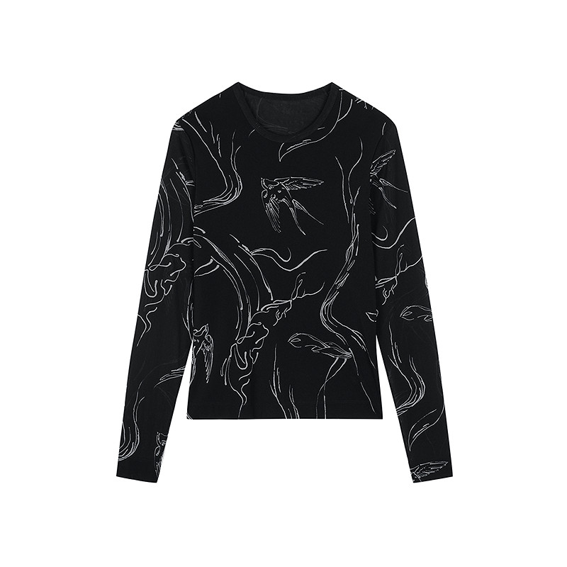 LESS春季修身薄上衣女印花高弹显瘦长袖打底T恤皮肤衣2P211511H