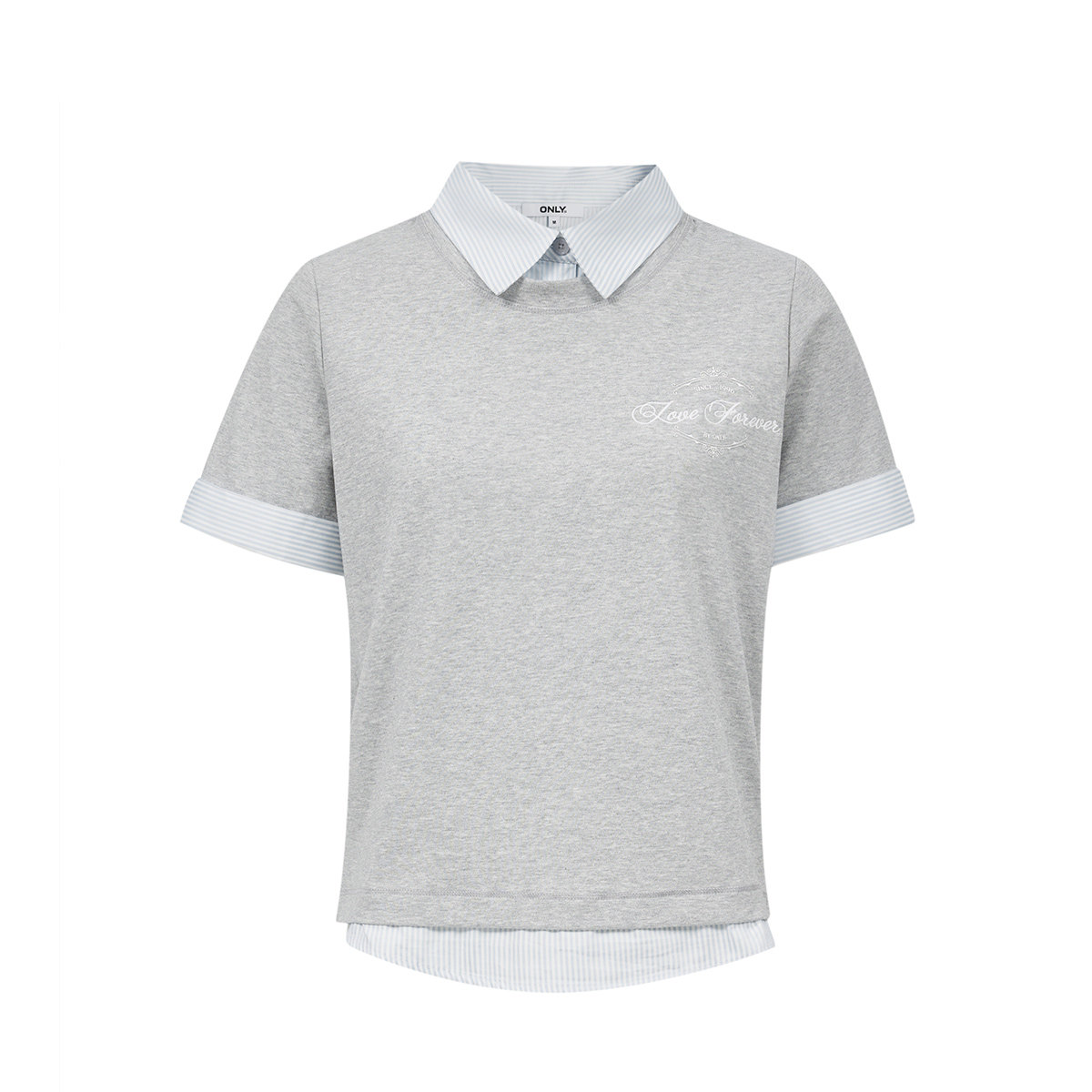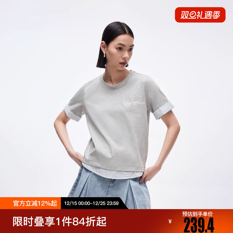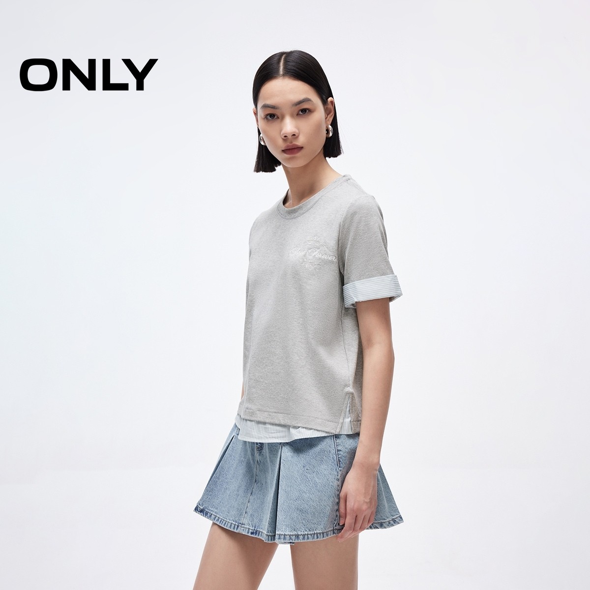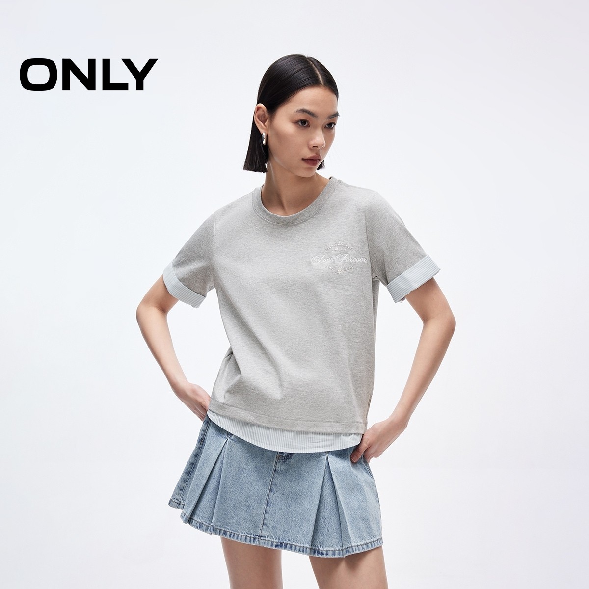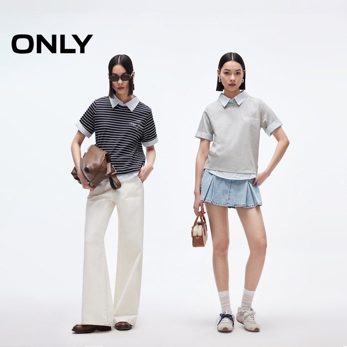 绫致ONLY2025冬新款松弛感元气假两件条纹字母印花设计正肩T恤女