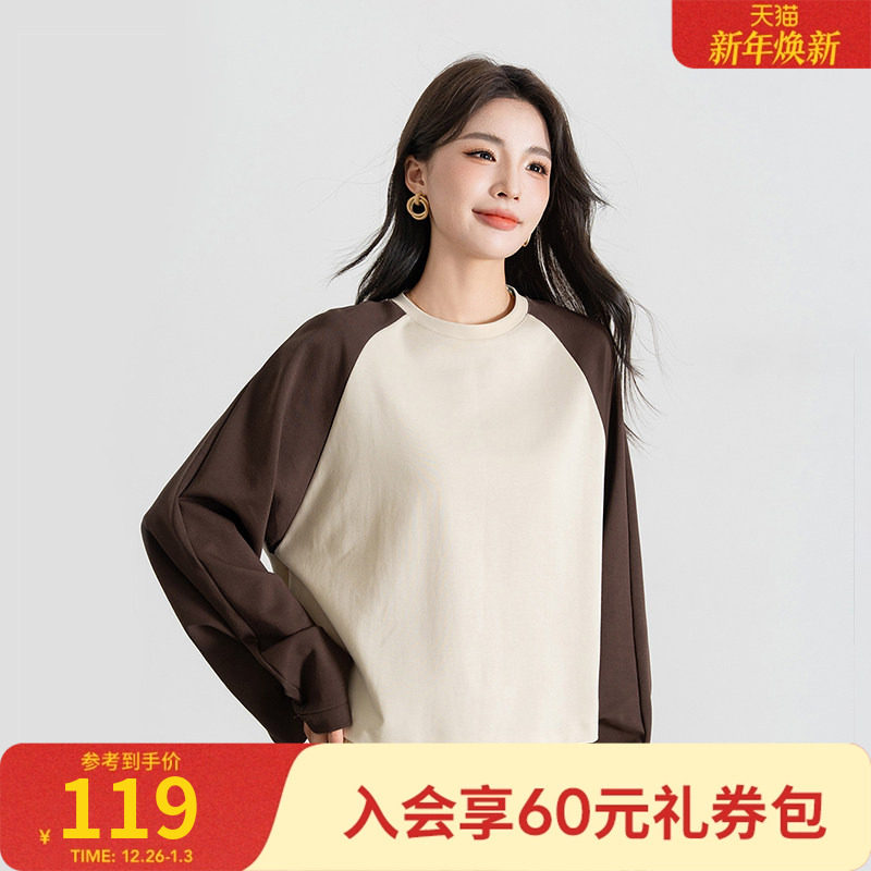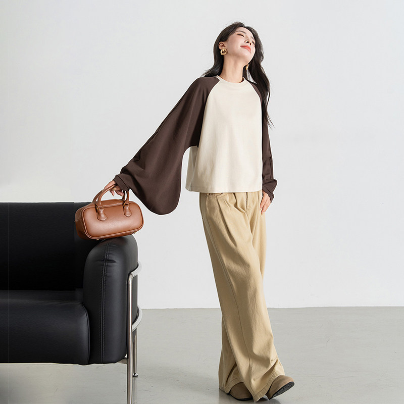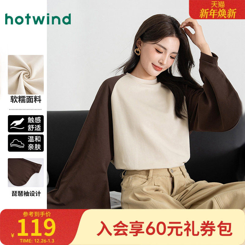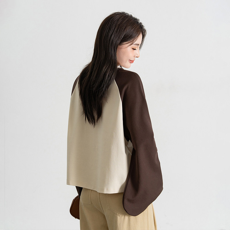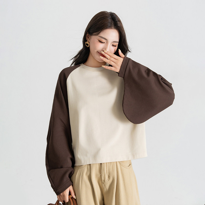 热风女士设计感琵琶袖复古撞色T恤秋季女款休闲百搭长袖短款内搭