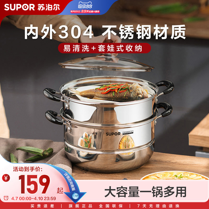 苏泊尔蒸锅304不锈钢家用蒸笼双层蒸煮两用大容量燃气电磁炉通用