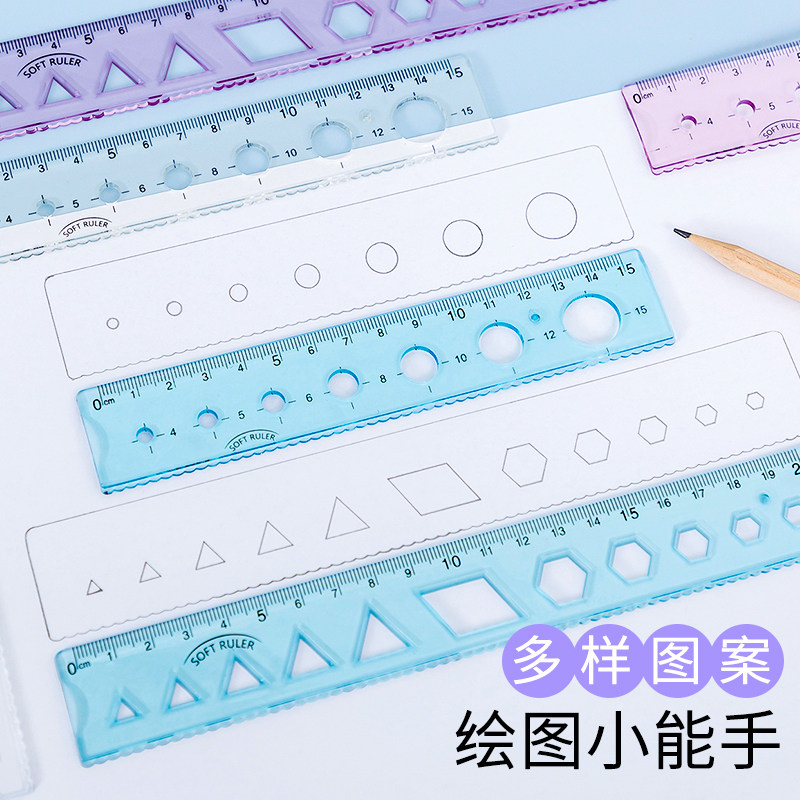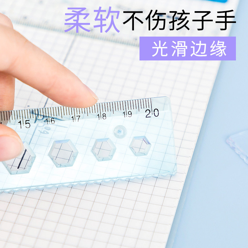 小学生尺子带波浪线软尺学生文具多功能量角器15cm20透明直尺儿童可弯曲镂空尺格尺画画图形绘图测量工具专用