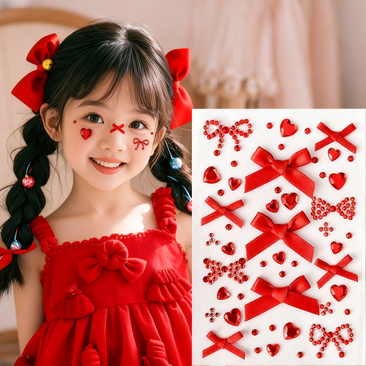 新年跨年儿童舞台妆脸贴烟花炮竹装饰脸部妆容幼儿园圣诞雪花贴纸水钻大红色喜庆新娘蝴蝶结国风化妆拍照道具