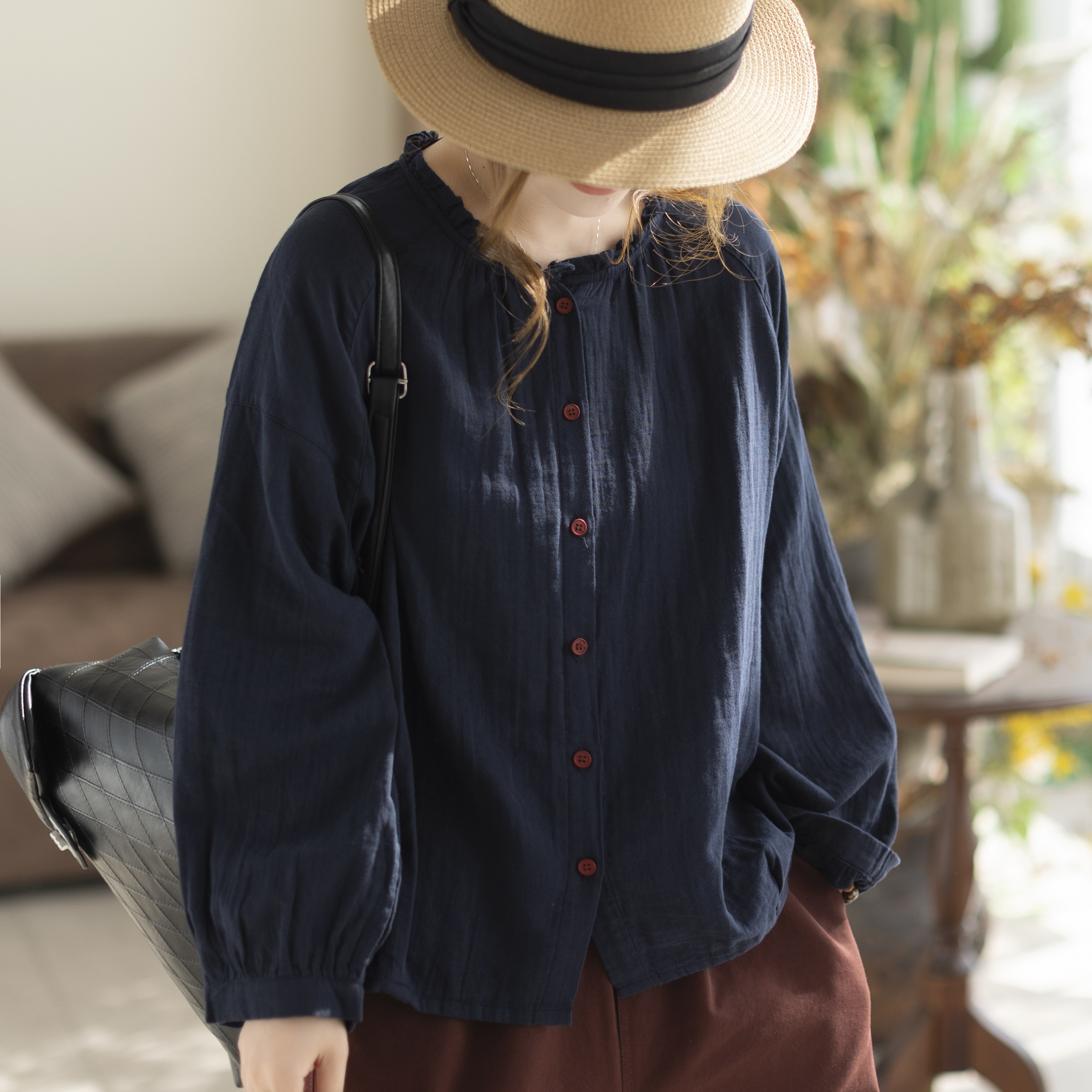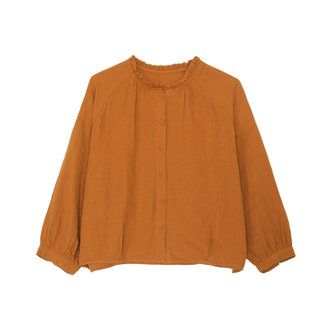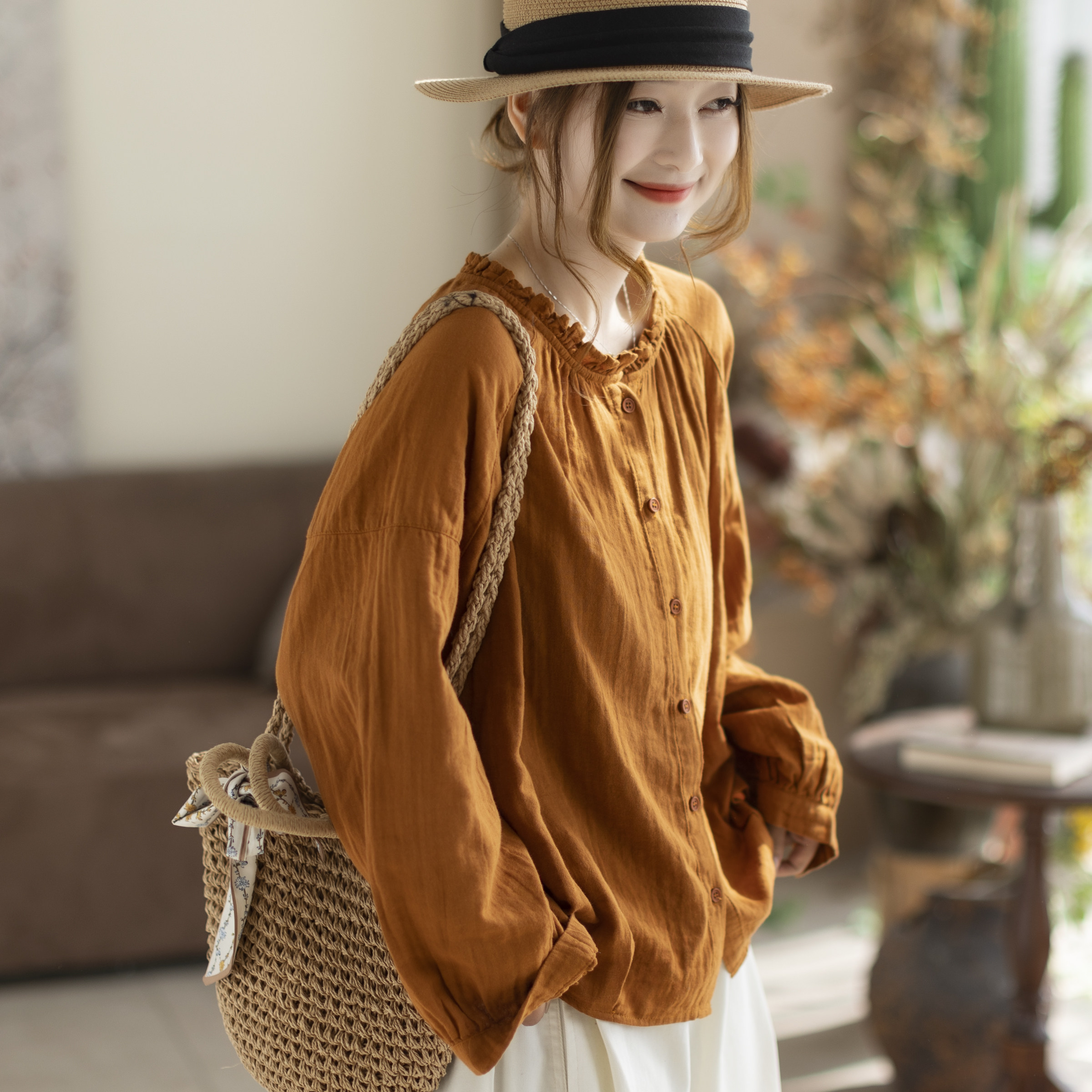 咖咪羽双层纱婴儿棉木耳花边衬衫简约风宽松长袖透气叠穿上衣女
