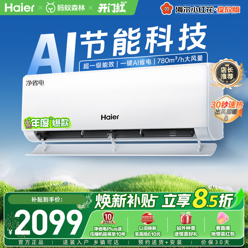 【国补8折】海尔空调1.5匹家用一级能效变频卧室挂机冷暖E1旗舰店