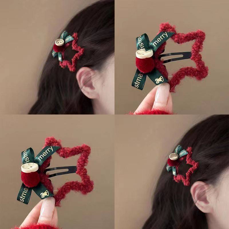 新年红色毛绒星星发夹蝴蝶结刘海BB夹侧边碎发夹发卡圣诞头饰发饰