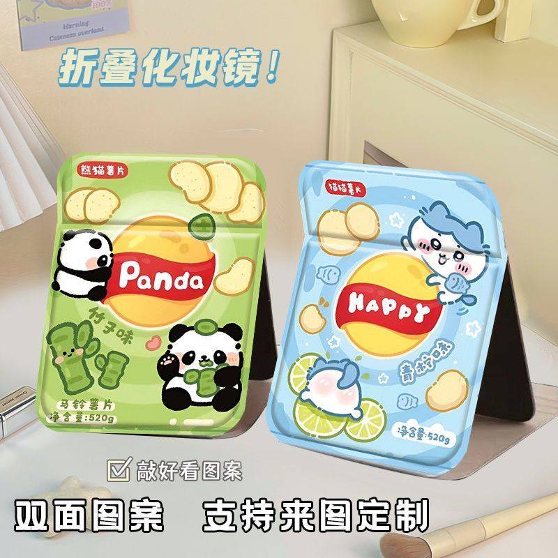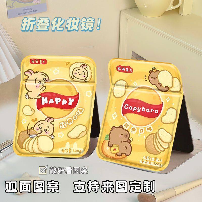 薯片卡哇折叠化妆镜便携式可爱梳妆镜学生台式镜子翻盖式玻璃发光