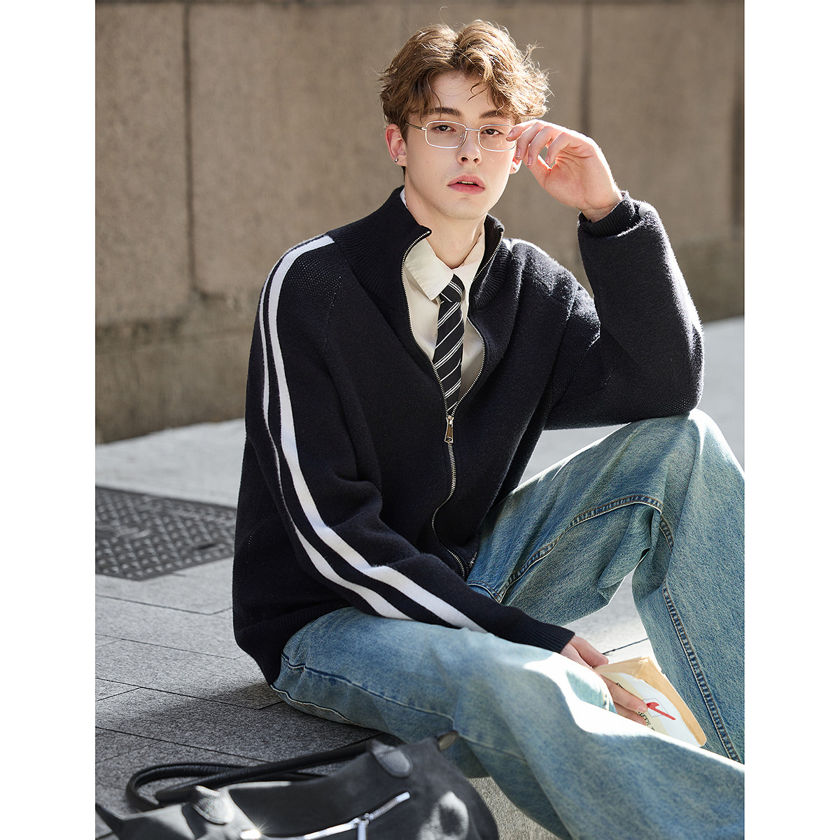 唐狮秋冬季毛衣男立领撞色运动风开衫毛线衫休闲风毛衣外套TM
