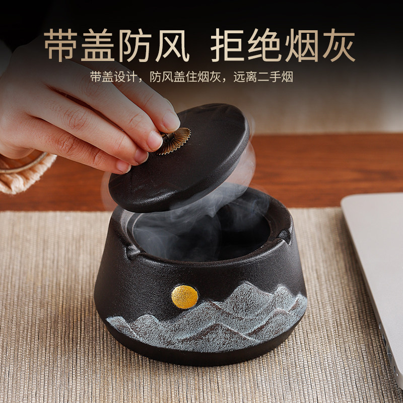 烟灰缸办公室酒店茶桌防灰飞带盖烟缸中式轻奢烟盅槽客厅家居防风