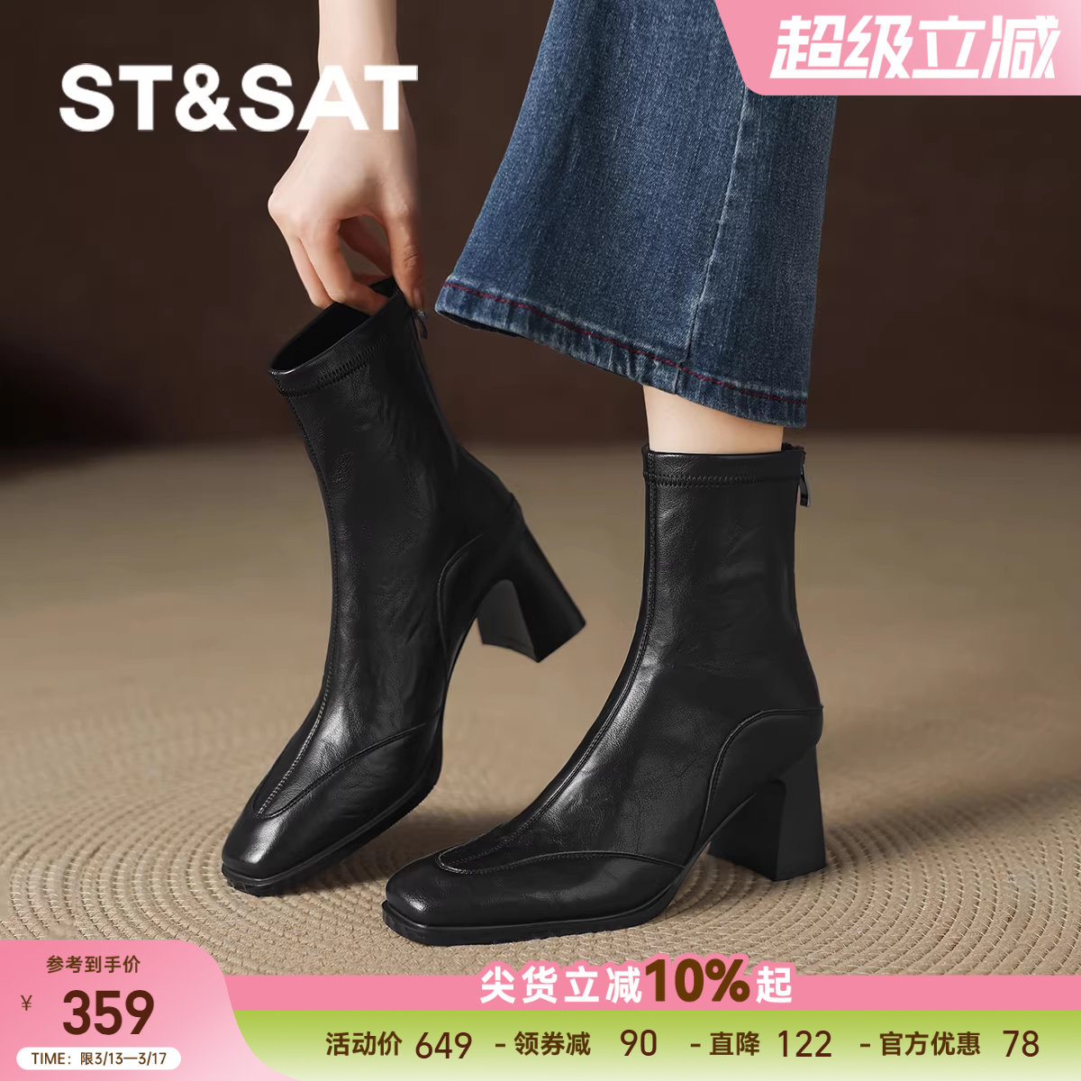 星期六高跟短靴女2025秋冬新款法式气质粗跟瘦瘦靴黑色高级感靴子