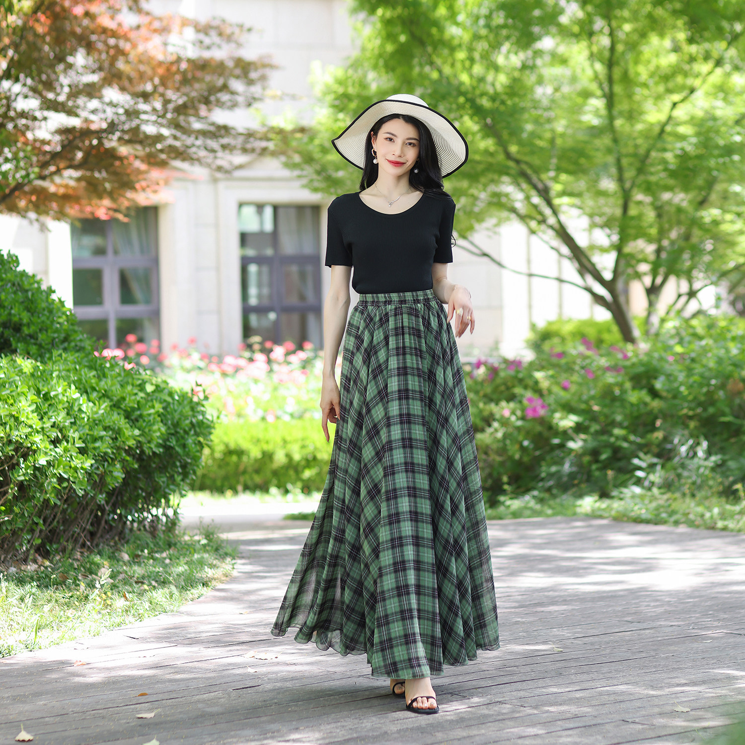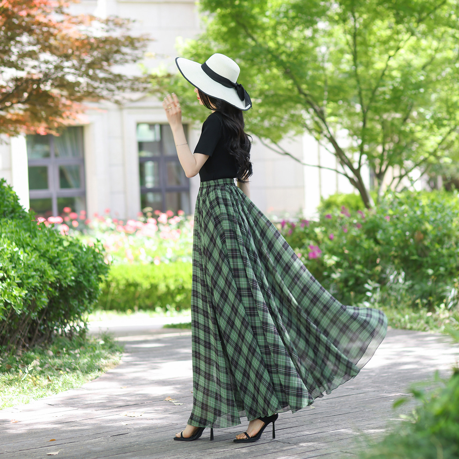 540度飘逸大摆半身长裙夏女半身裙格子裙气质雪纺A字垂感沙滩舞裙