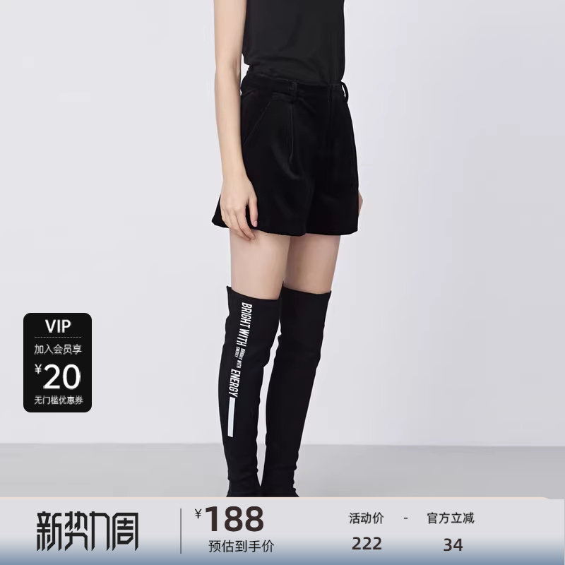 sdeer圣迪奥女装复古插袋压褶灯芯绒A字黑色短裤S21480907