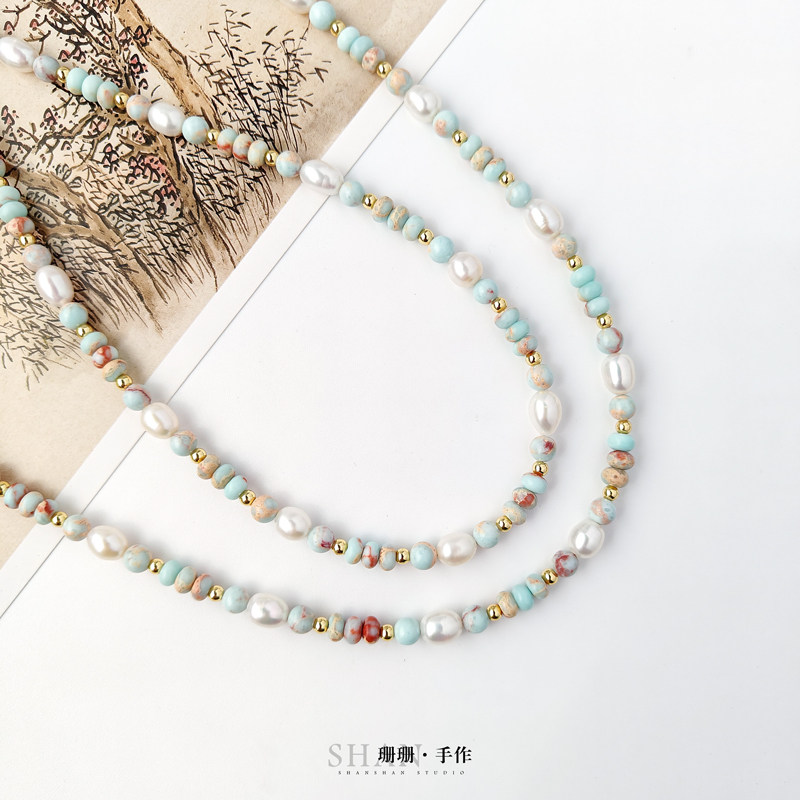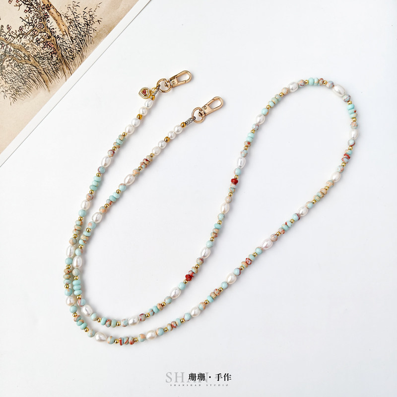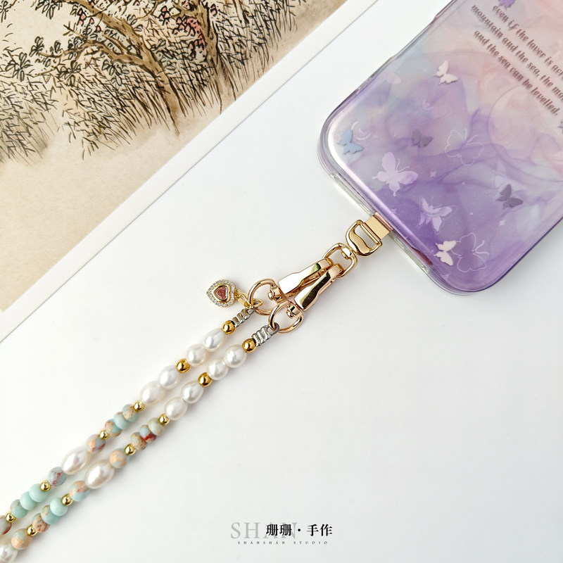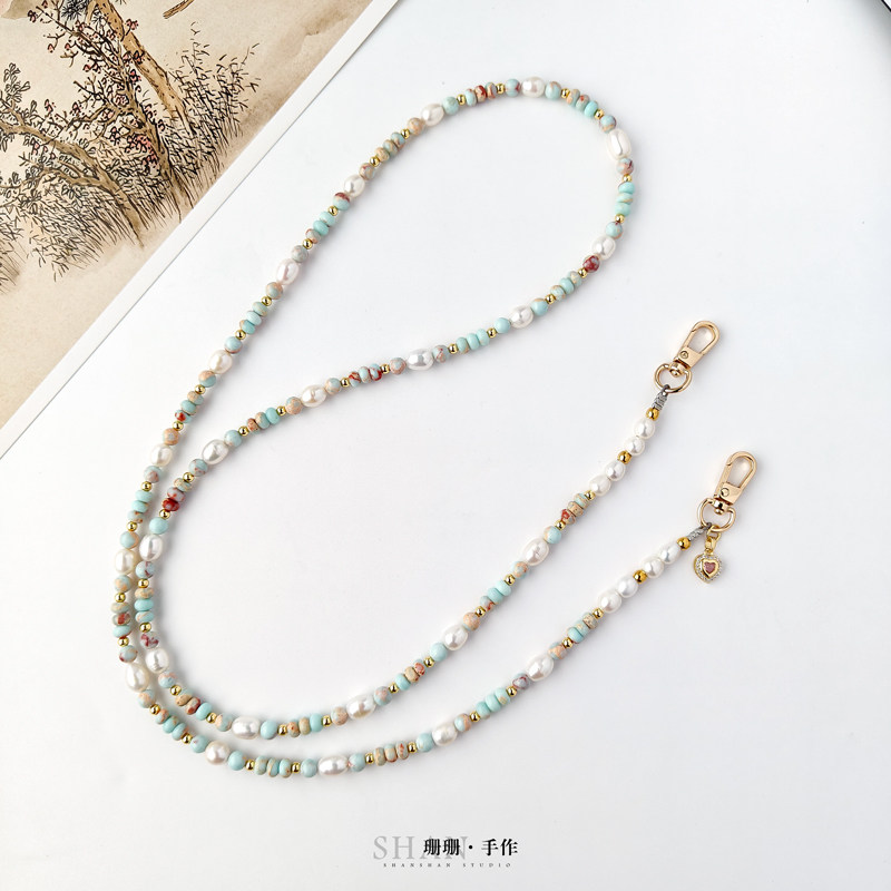 原创手机斜跨链天然珍珠寿山石长链背带单肩斜背包包简约挂绳送礼