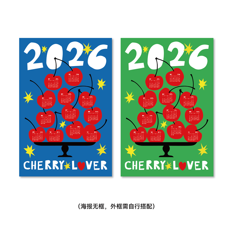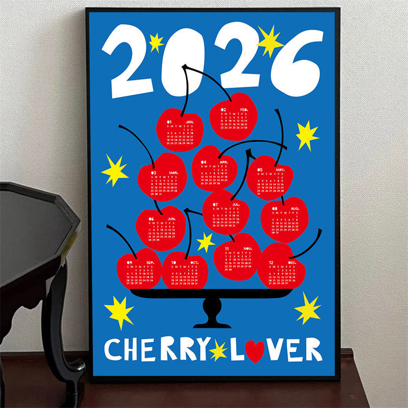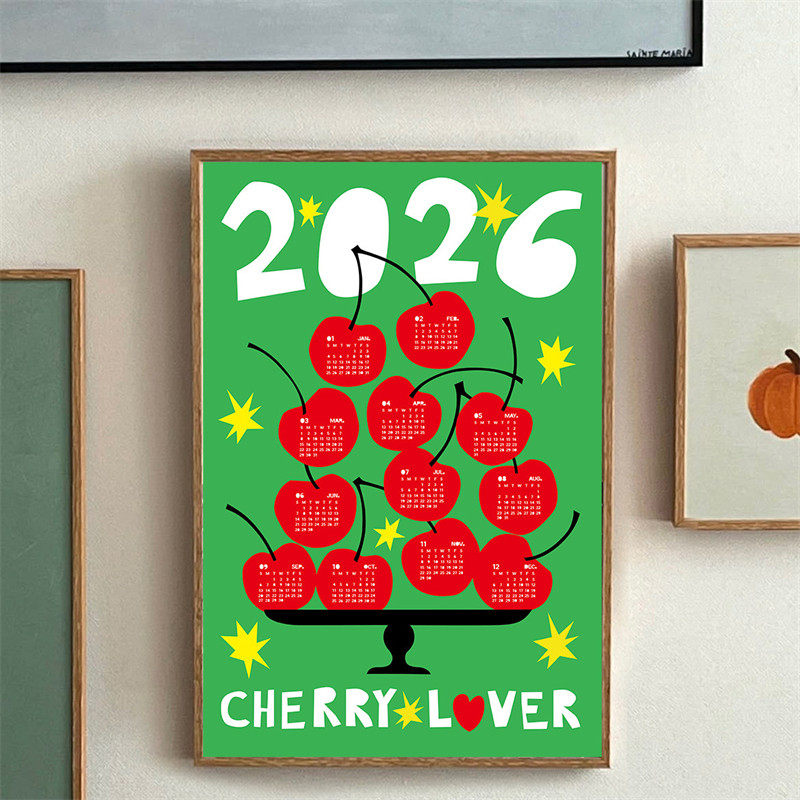 2026樱桃日历创意简约风装饰画芯艺术多巴胺插画家居装饰海报无框