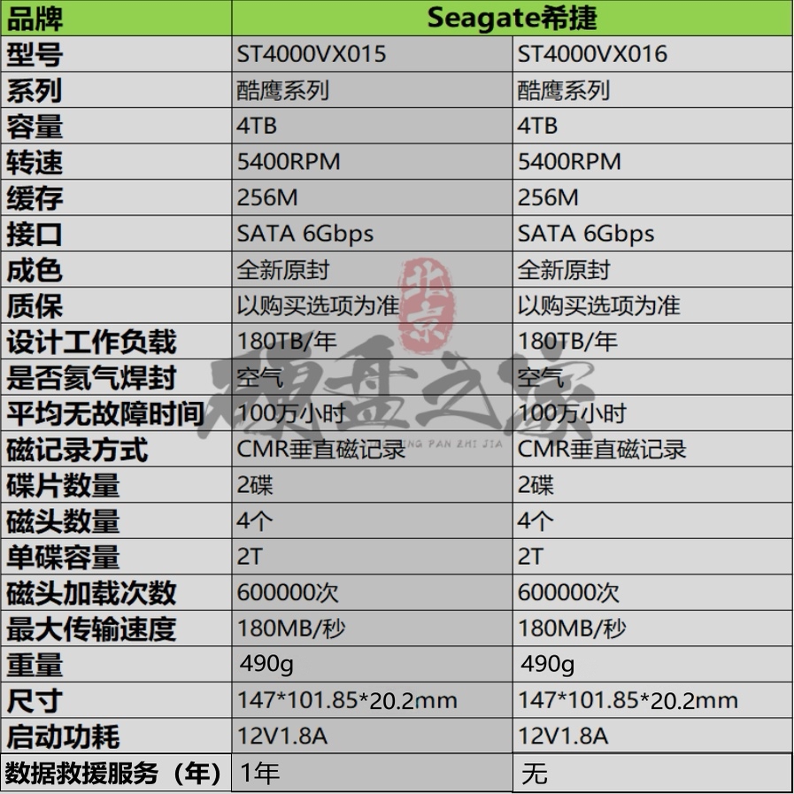 联保希捷酷鹰ST4000VX015 VX016 CMR 4T TB 3.5寸视频图像用硬盘