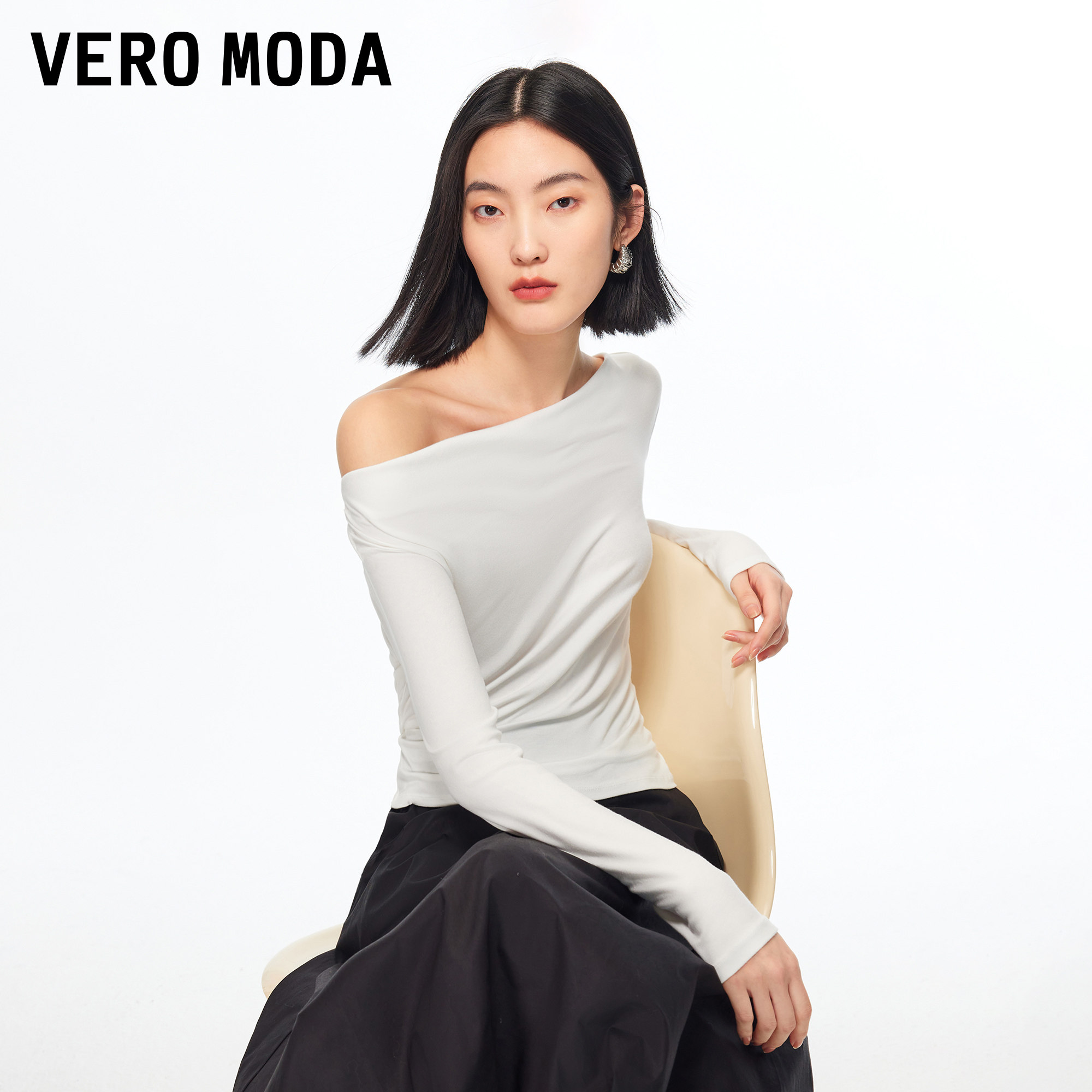Vero ModaT恤2026春季新款简约百搭修身短款气质长袖荡领收腰上衣