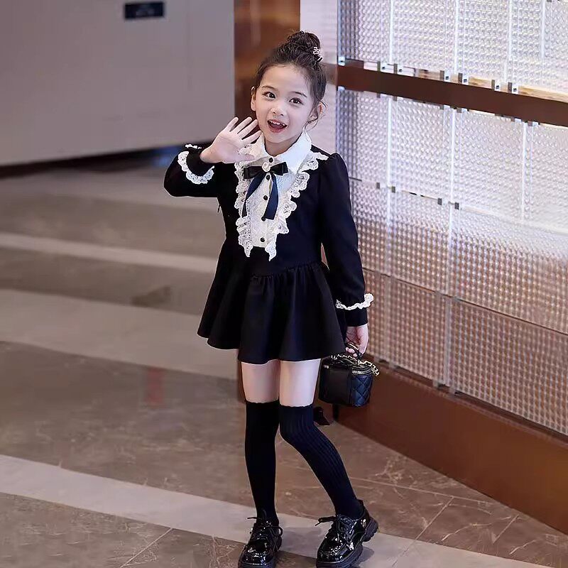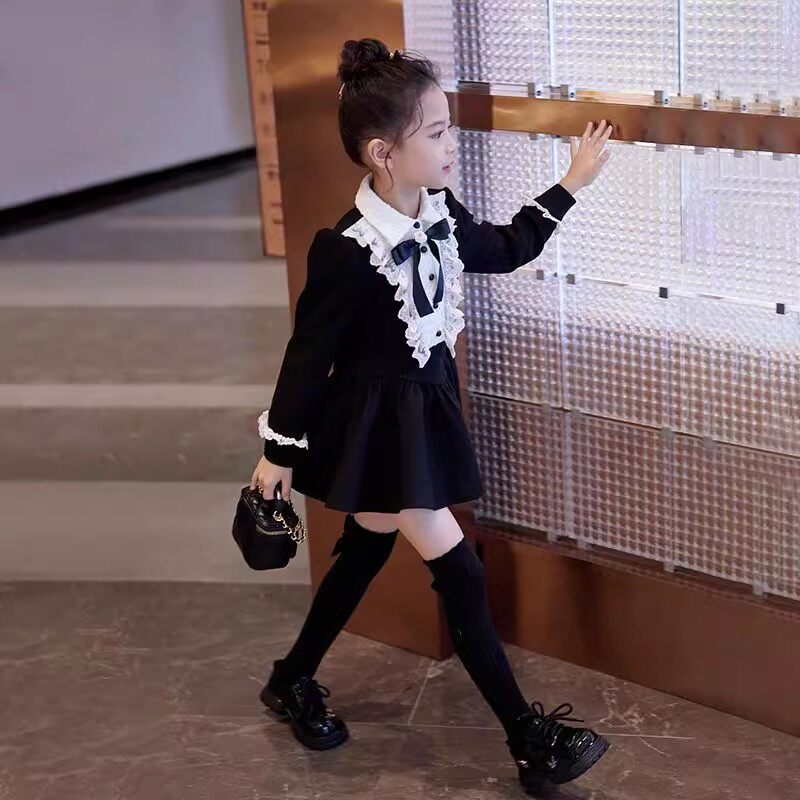 女童黑色赫本风连衣裙春秋装新款儿童学院风小女孩公主气质小黑裙