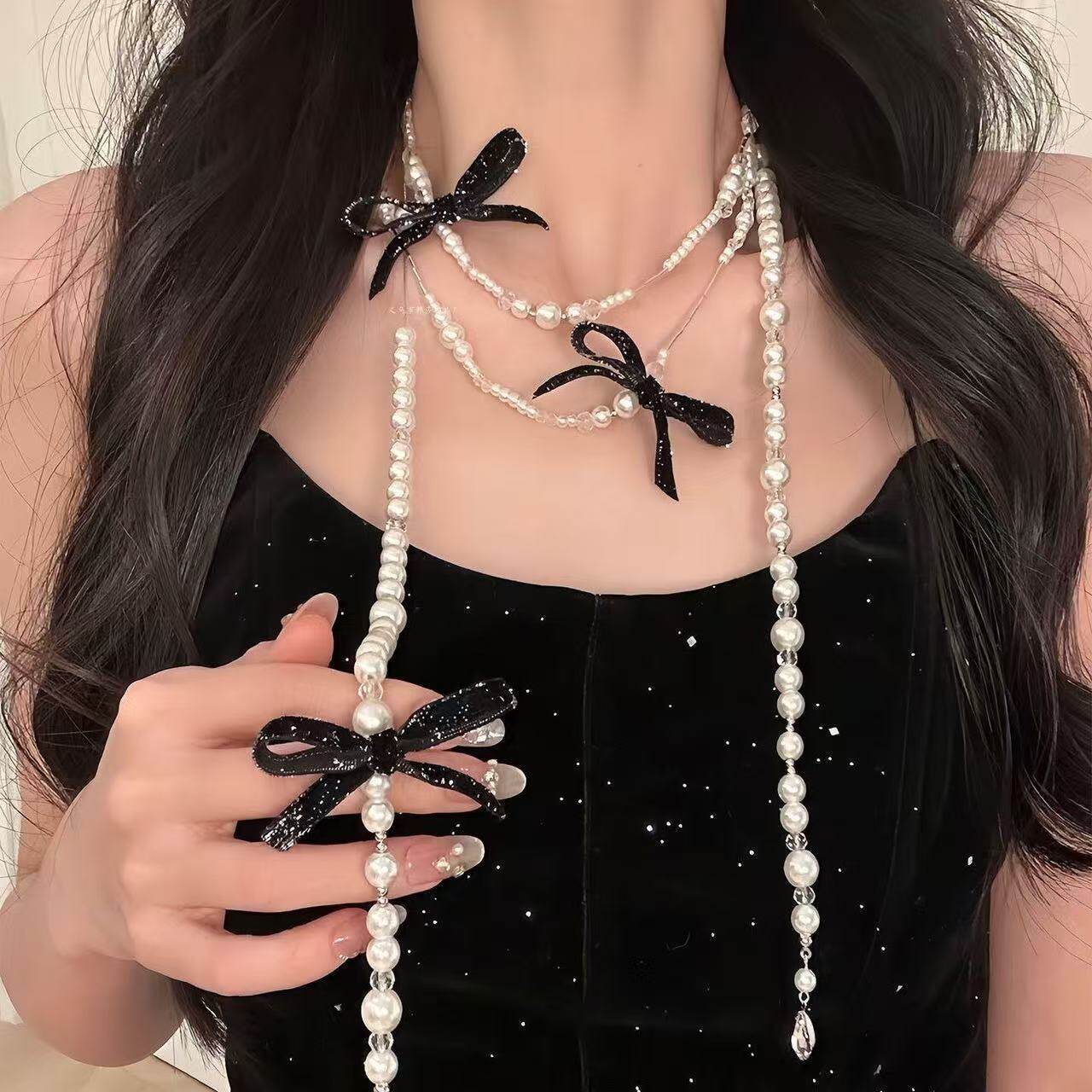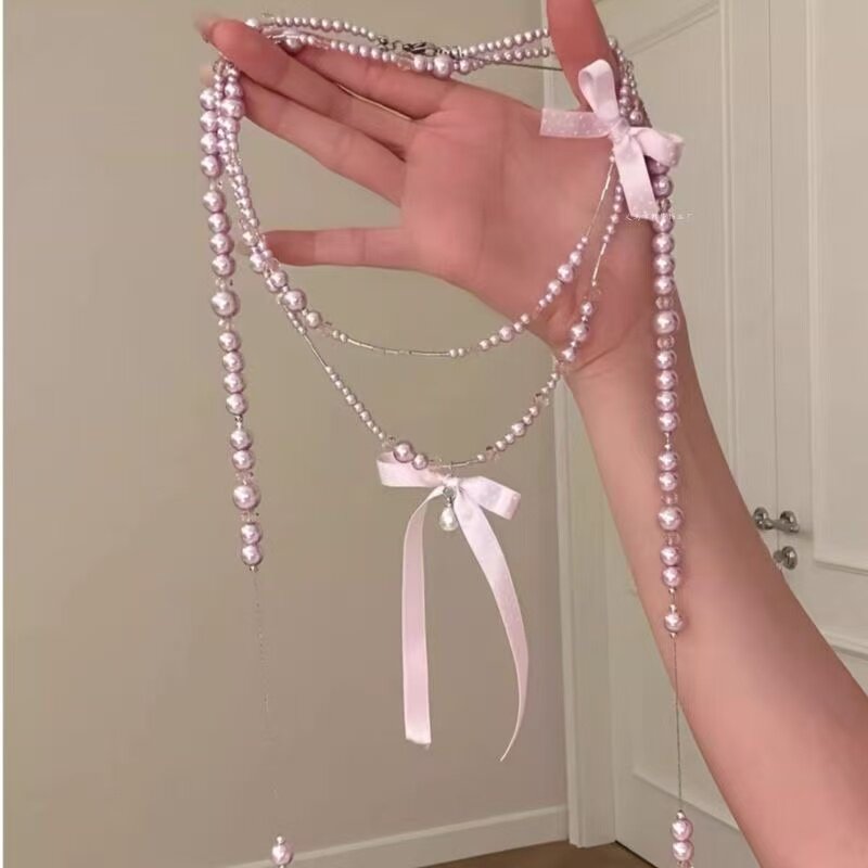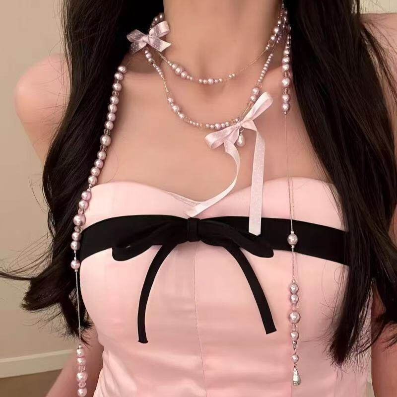 【名伶千金】小香风粉色蝴蝶结珍珠项链长款叠戴锁骨链毛衣链颈链