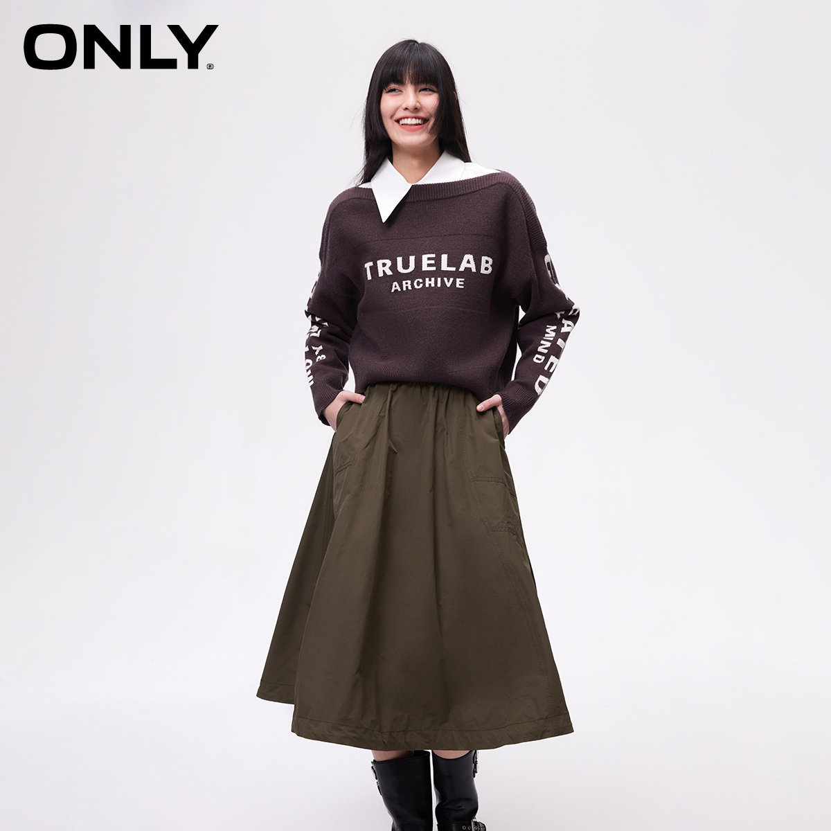 【ONLY奥莱】春季新款时尚简约显瘦高腰中长款A字半身裙女