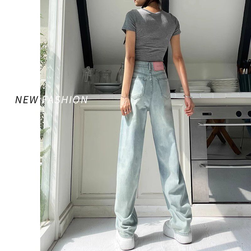 汐家女裤 春季新款大码高腰宽松阔腿拖地牛仔裤浅色系九分弯刀裤