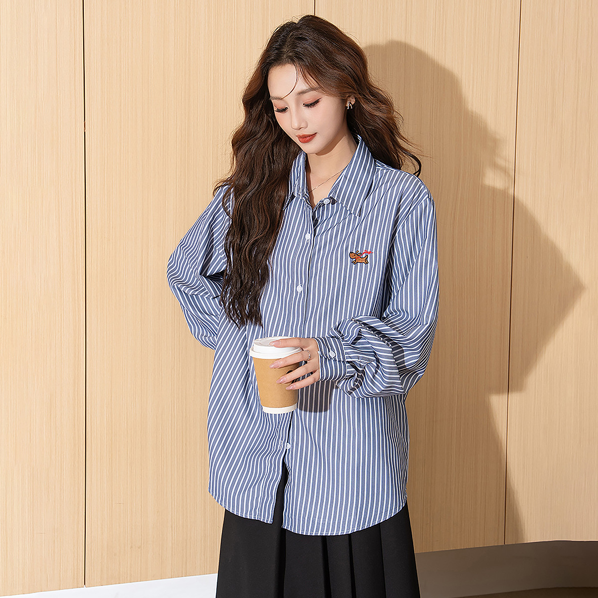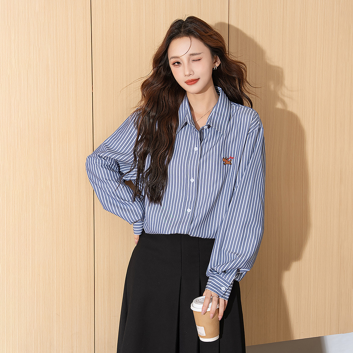 唐狮秋季衬衫女新款长袖条纹可爱日常百搭流行休闲开衫TM