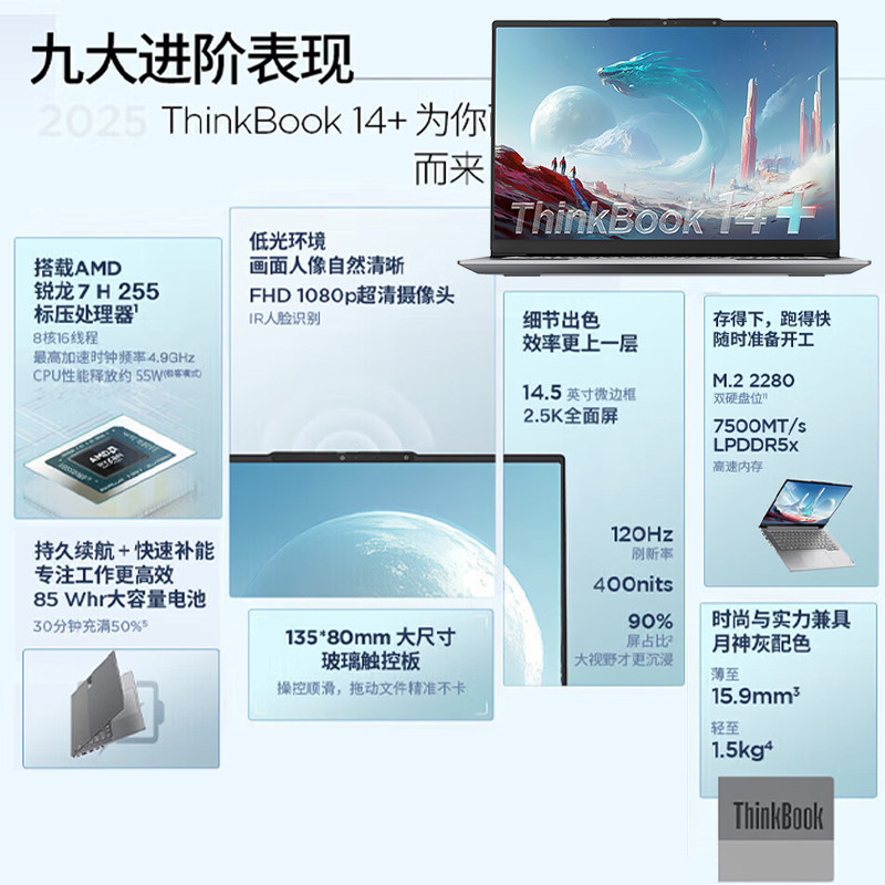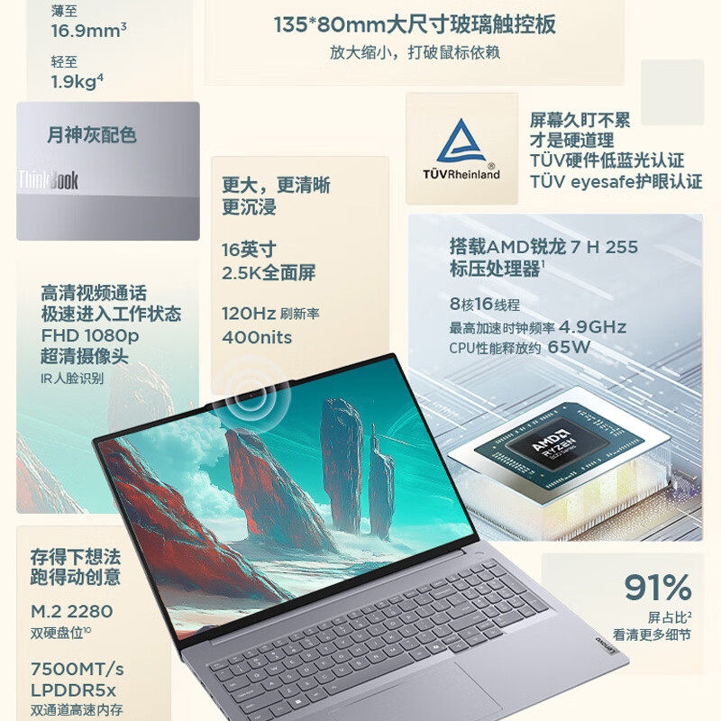 ThinkPad笔记本电脑ThinkBook14+AMD锐龙R7 H 255 24GB+512GB轻薄商务办公电竞学生编程剪辑设计生产力192