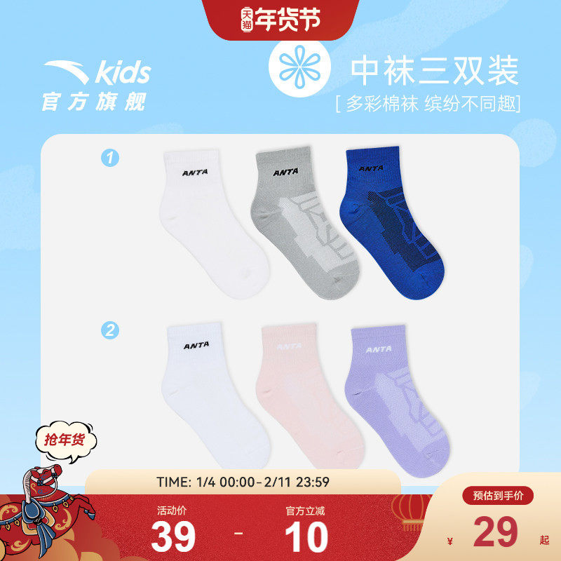安踏儿童袜子男童跑步袜子女童袜子精梳棉运动三双装短袜子莫代尔