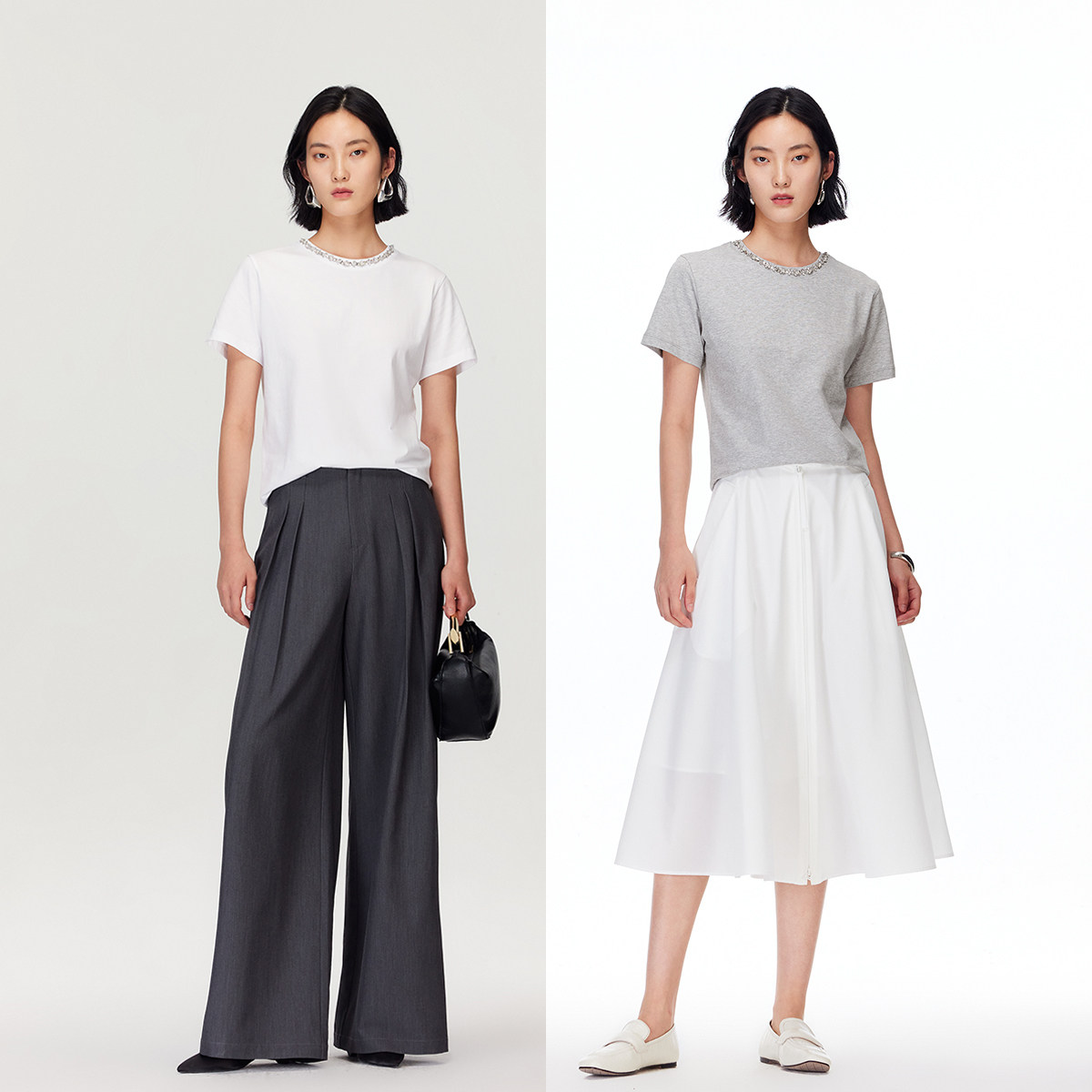 领口钉珠装饰 贵气优雅;短袖设计 轻薄舒适