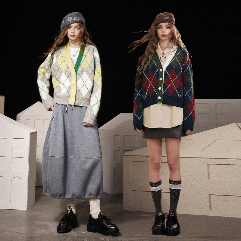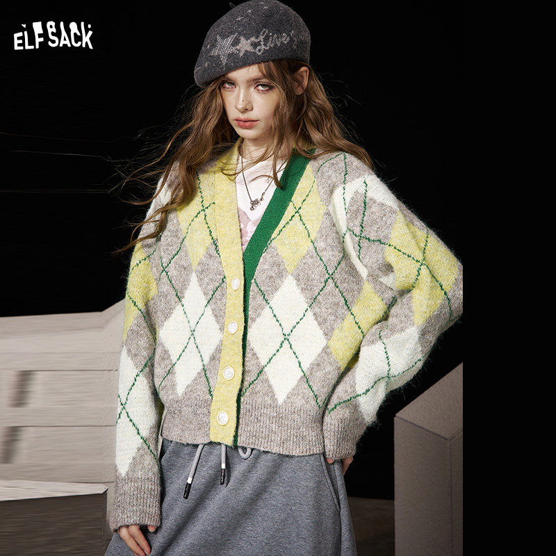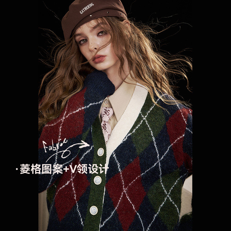 妖精的口袋菱格v领开衫绵羊毛毛衣女2025年冬季新款慵懒新年穿搭
