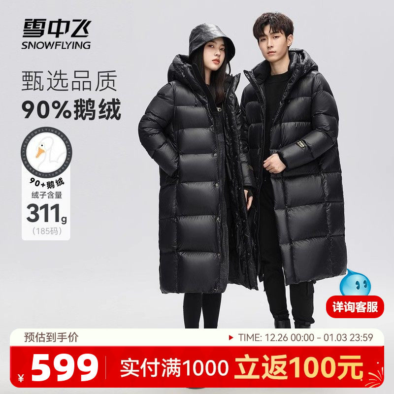 雪中飞黑曜石系列2025秋冬男女情侣长款鹅绒超厚大码羽绒服外套