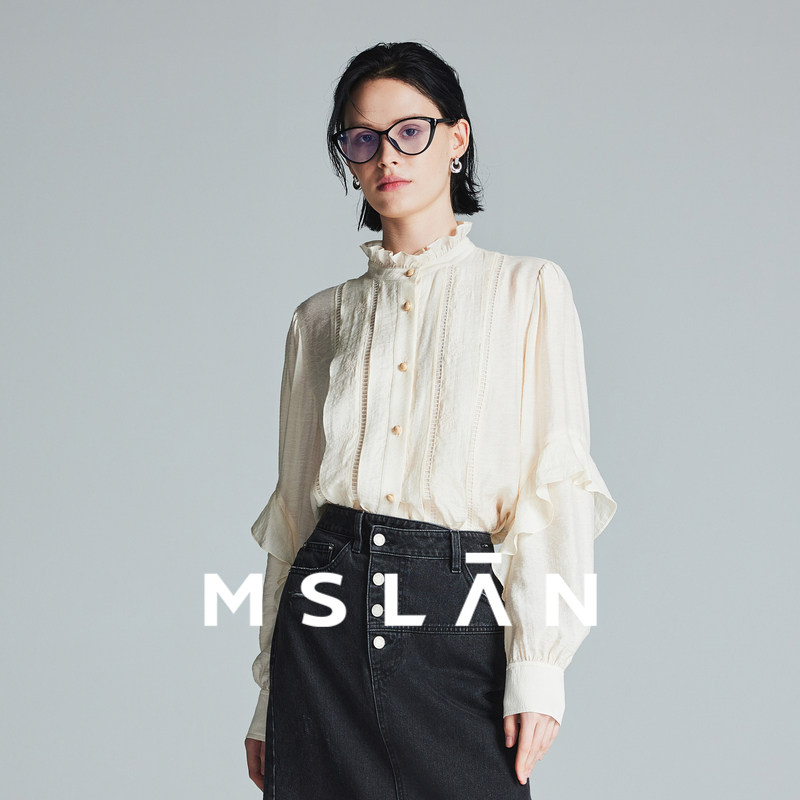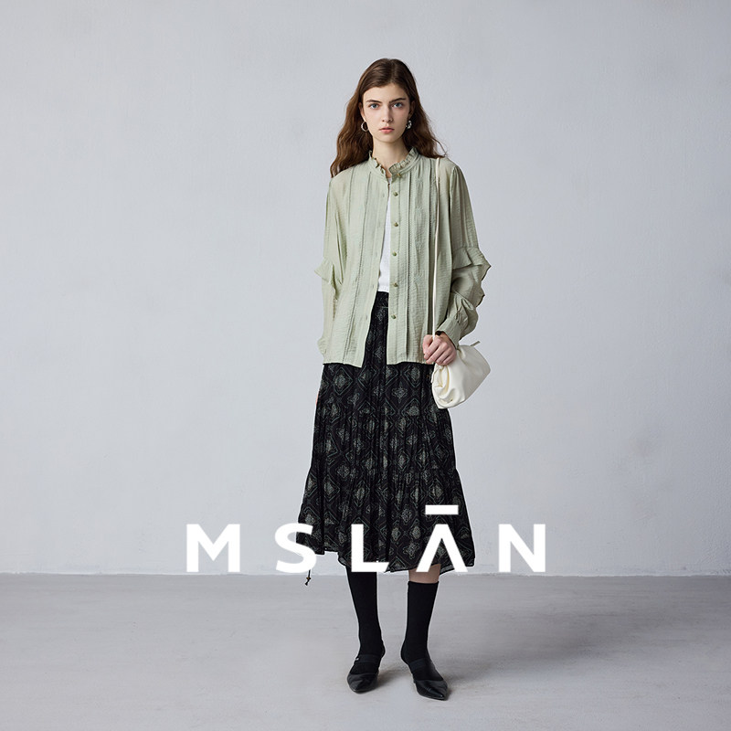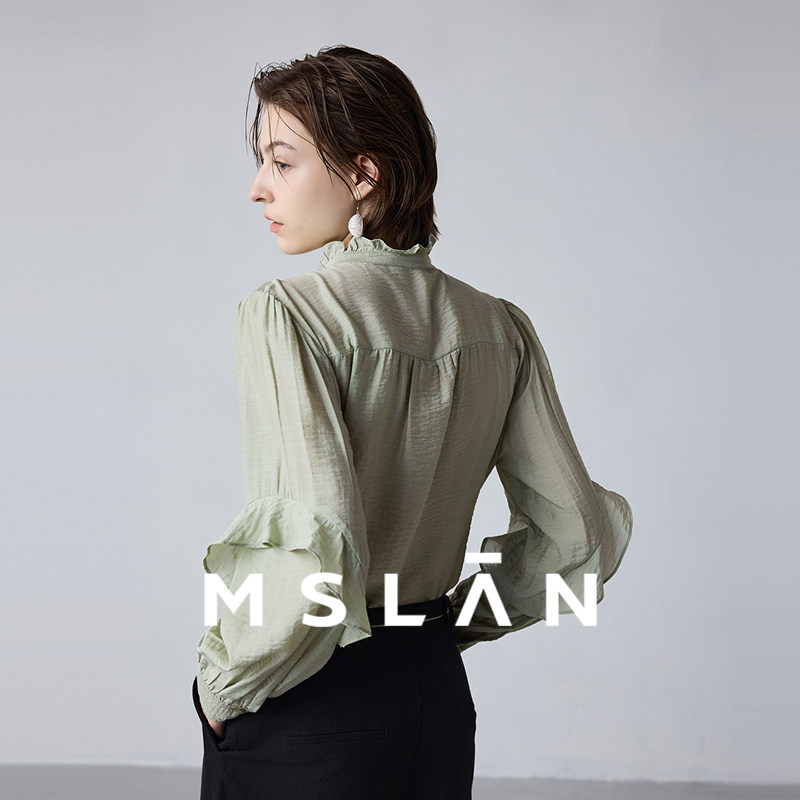 明星同款\MSLAN浅春系优雅荷叶边衬衫立领牛油果绿衬衣MFDN154