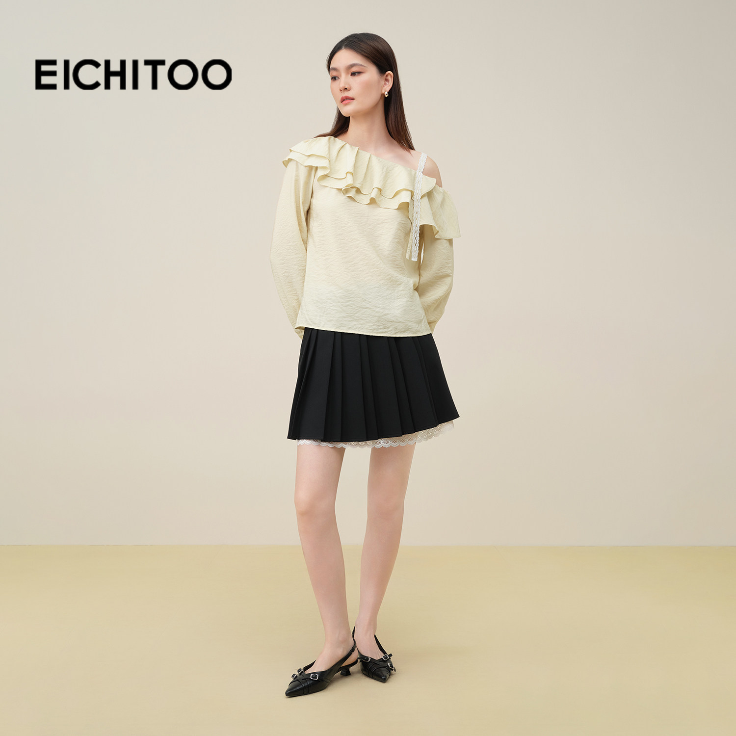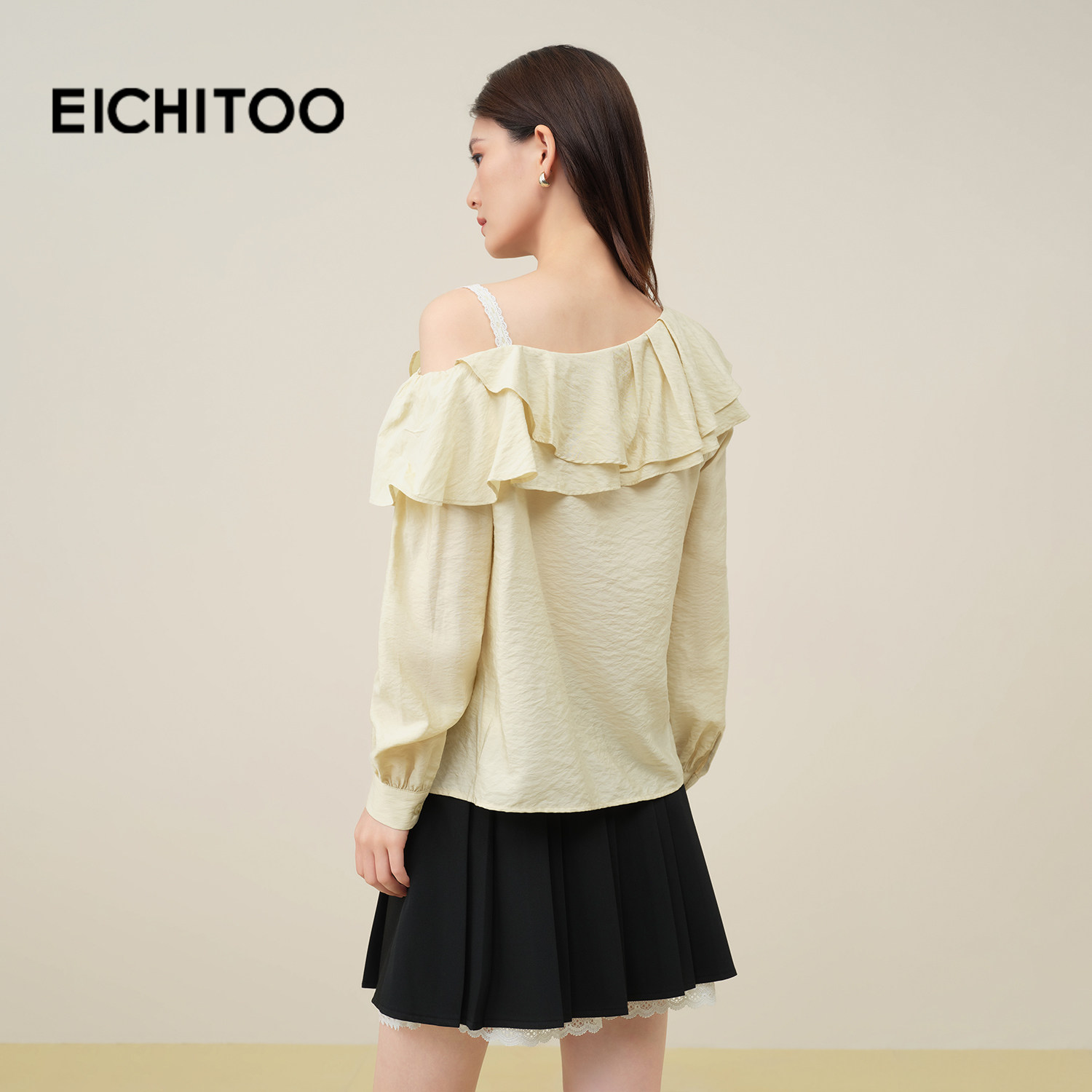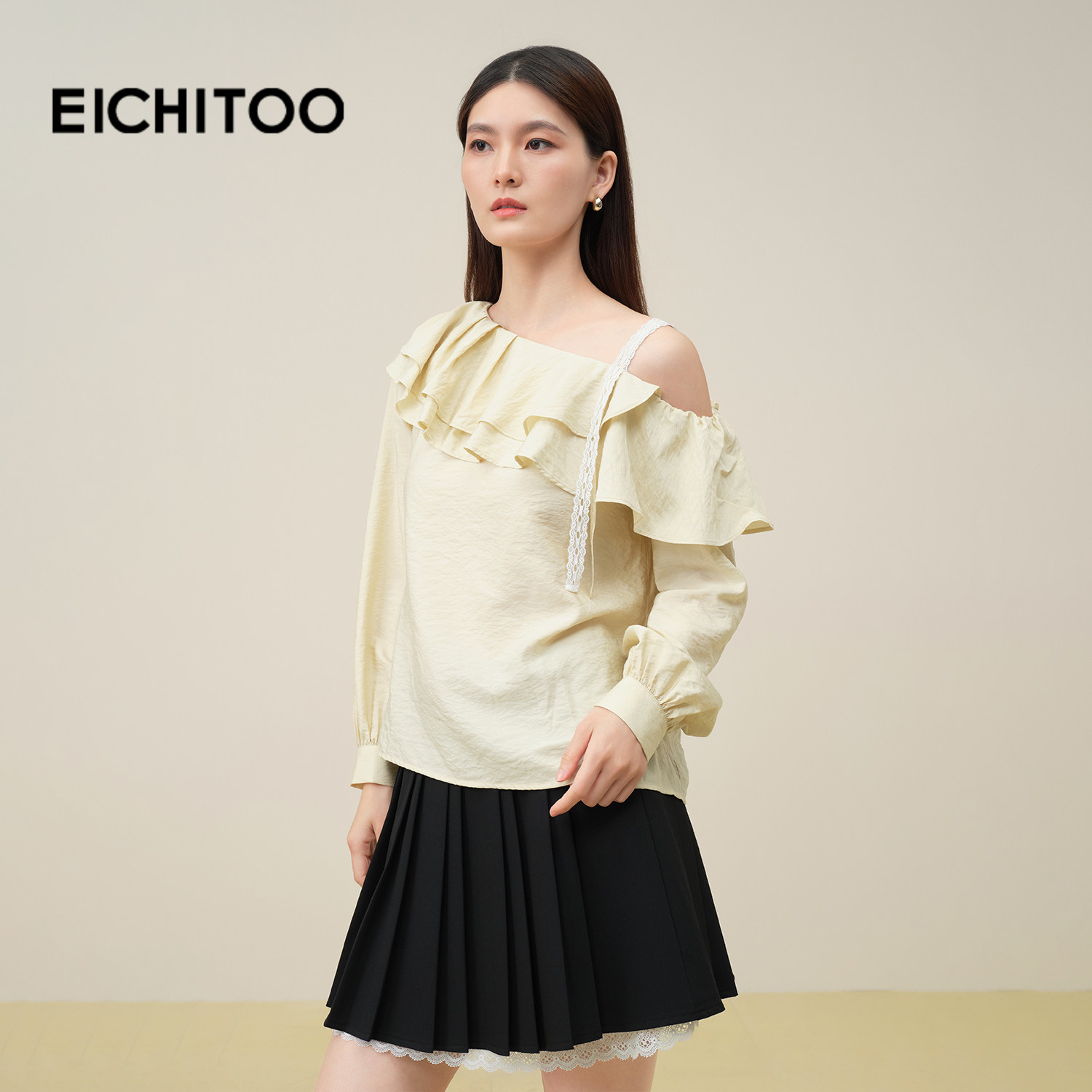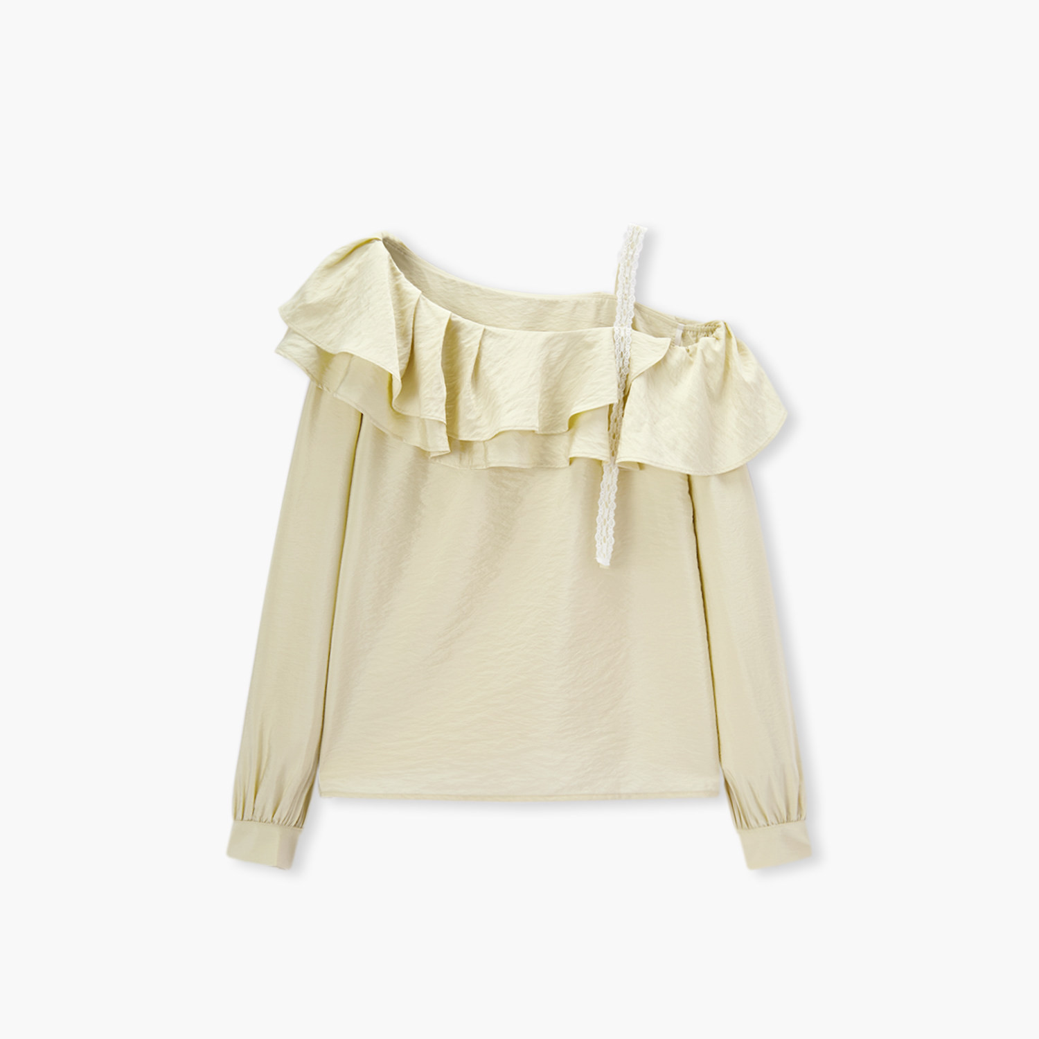 爱居兔一字肩雪纺衫衬衫女2025年秋季新款荷叶边拼接优雅长袖小衫