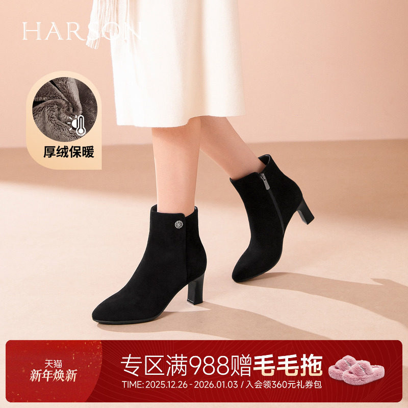 哈森气质尖头时装靴加绒保暖舒适百搭女短靴2025冬新款HA257919
