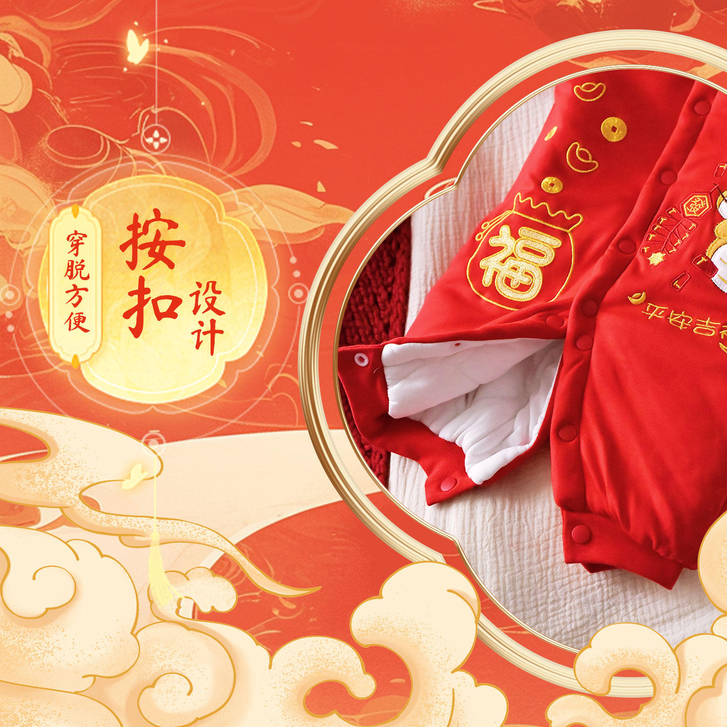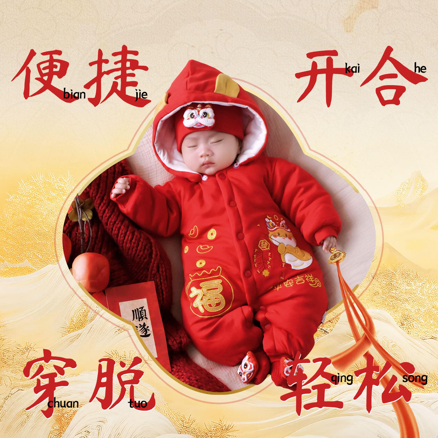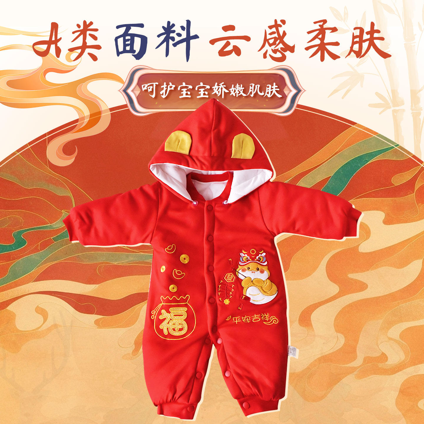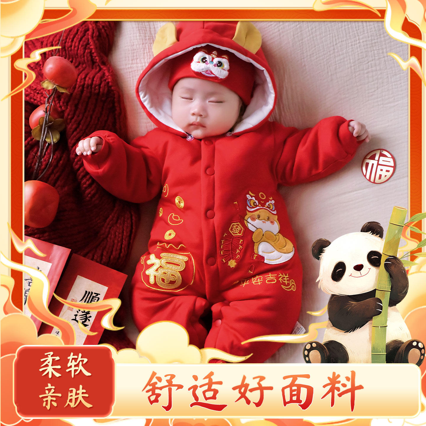 婴儿冬天棉服加绒加厚连体衣宝宝长袖哈衣红色喜庆新中式外出满月