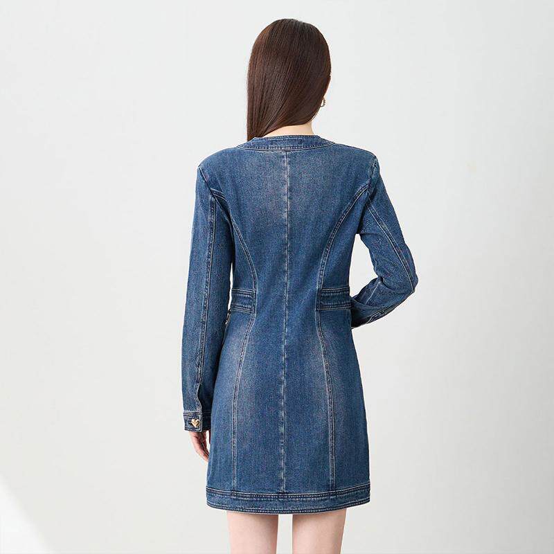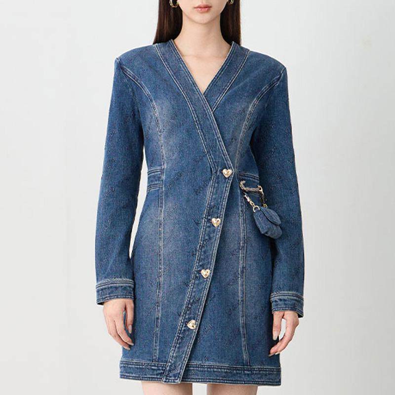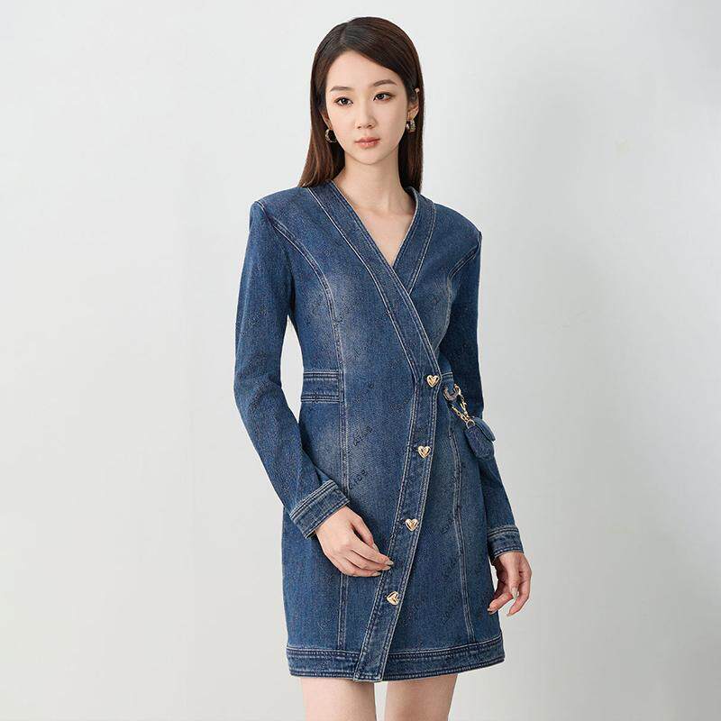 kodice秋冬新品蓝色V领牛仔裙子连衣裙修身长袖时尚气质链条包