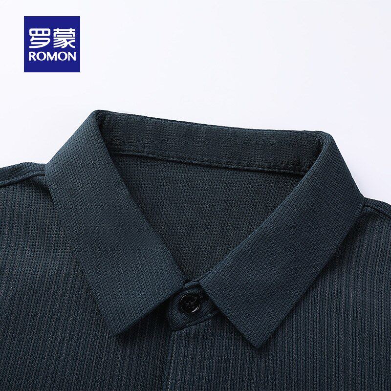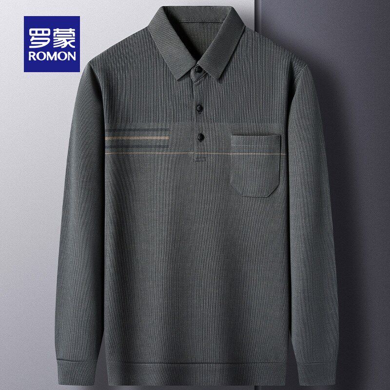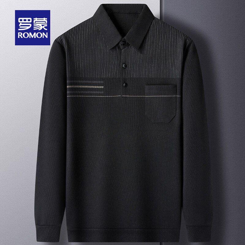罗蒙男士休闲条纹口袋款长袖POLO衫2026春季新款中老年爸爸装T恤