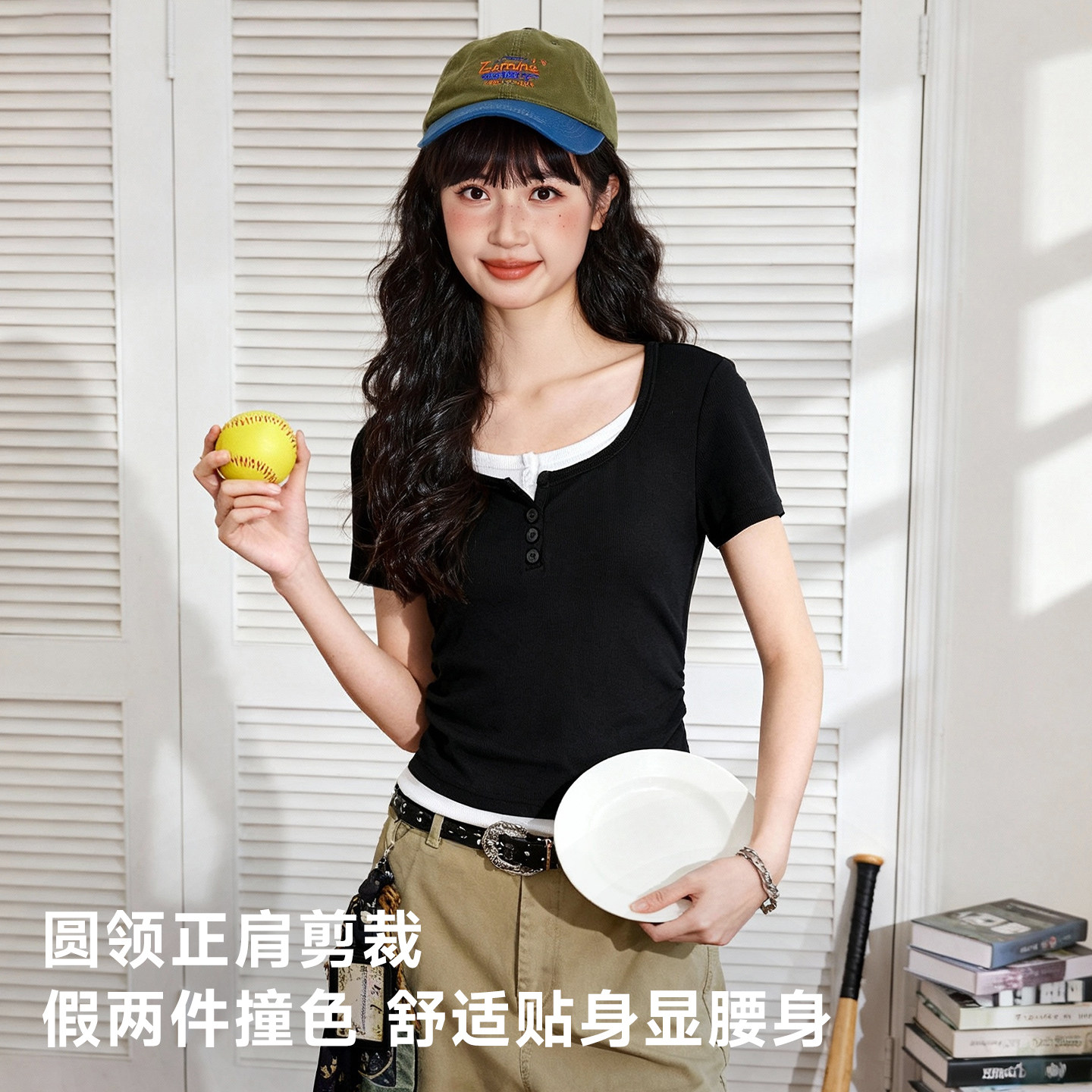 唐狮官方黑色正肩短袖t恤女2026新款夏季女士修身假两件上衣女VB